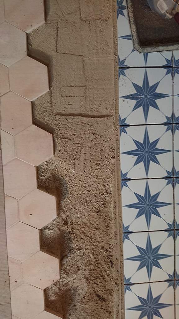 Après avoir définit la largeur laissée entre la tomette et le carrelage, Gwen a installé une banche et nous avons coulé un ciment prompt, afin de faire un socle sur lequel installer un listel métal qui viendra trancher entre les deux matières.