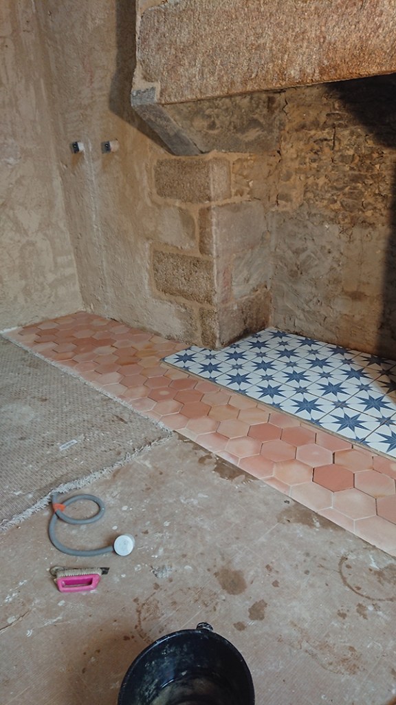 - L’entre deux tommette/carrelage devant la cheminée sera marqué par un listel métal, scellé dans du joint carrelage.