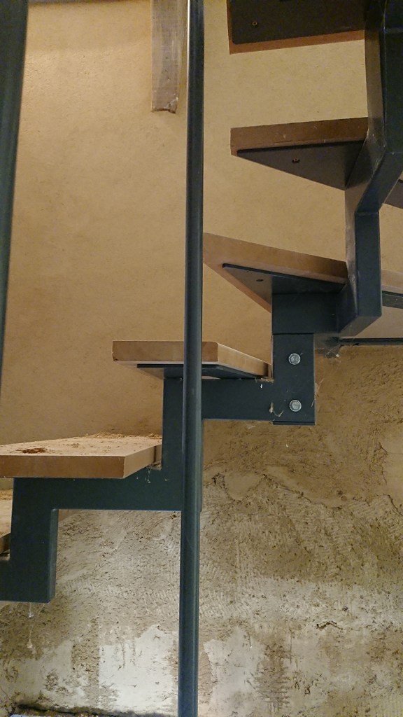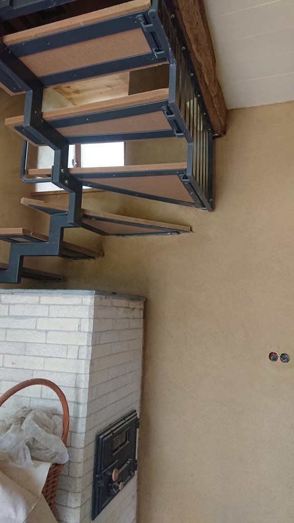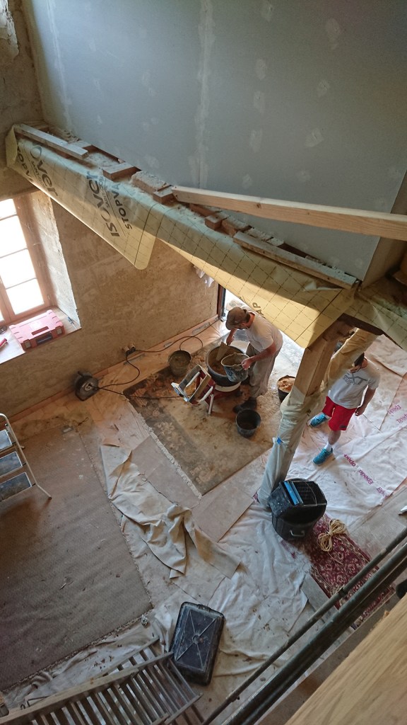 Au bilan après ces 3 journées de chantier, la cage d’escalier a été faite, le petit pan côté Sud vers les toilettes et un grand pan (double hauteur) côté cuisine. La suite se passe en image 🙂