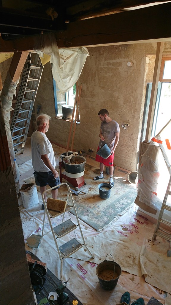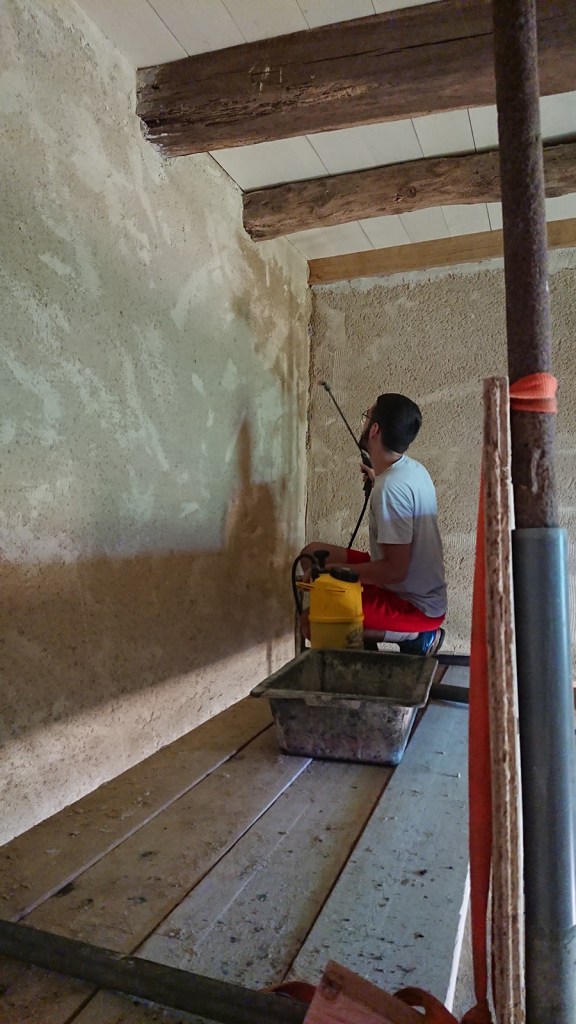 Alexandre, papa et Gwen se sont testé aux mélanges. Alexandre s’est aussi spécialisé dans l’humidification des murs avant la pose de l’enduit.