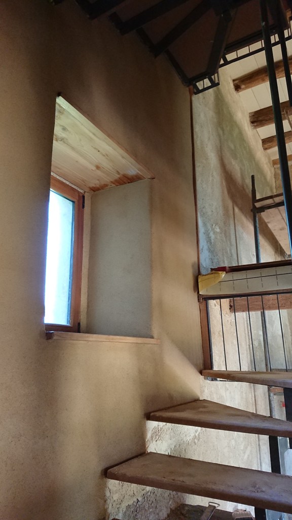 Et arrive enfin ce chantier, tant attendu, sésame pour la pose de la cuisine : les enduits de finition chaux/sable pour les pans restants (cage d’escalier, les doubles hauteurs dans la cuisine, cloison de la salle de bain).