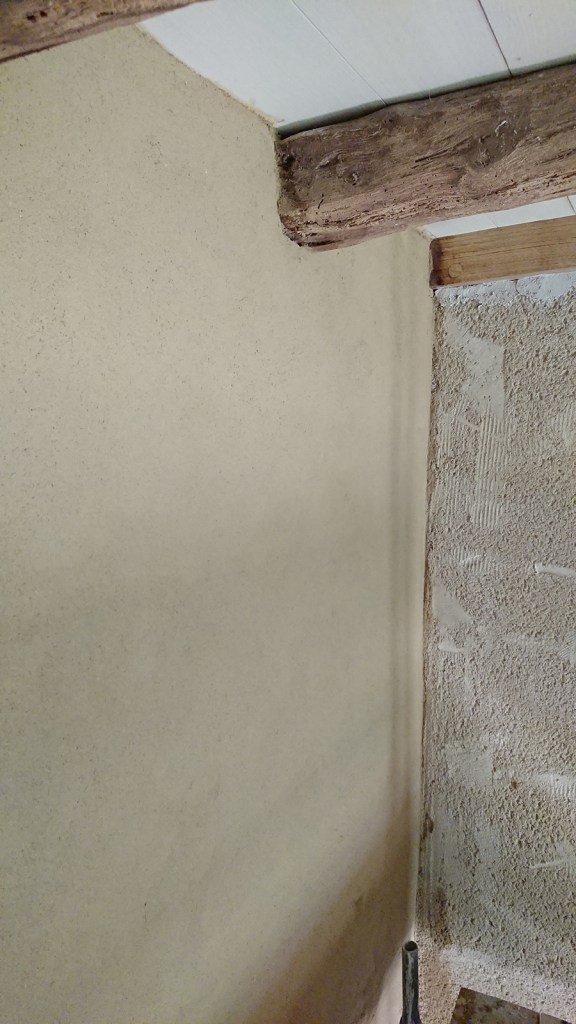 On entre dans le vrai, le final, le visible, la déco. Même si la moitié est réalisée, toute la pièce est déjà changée. On continue sur nos enduits, cette fois, on commence les finitions.