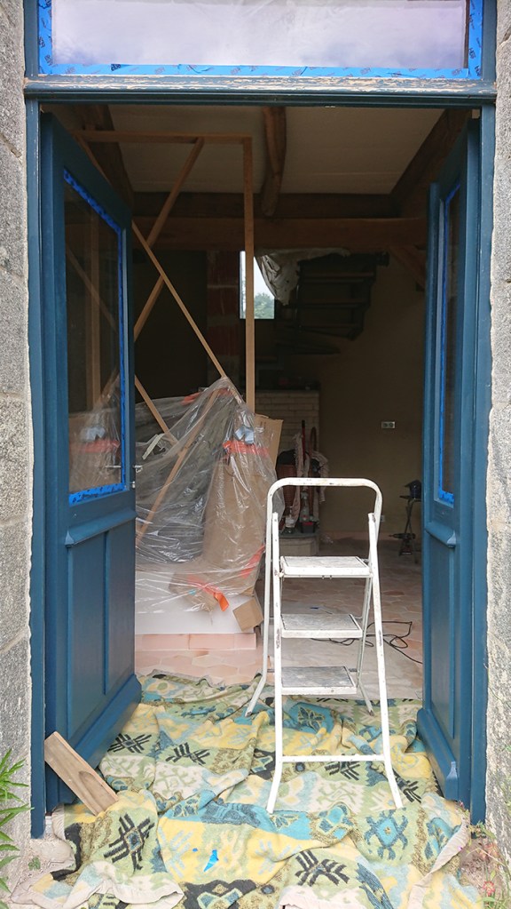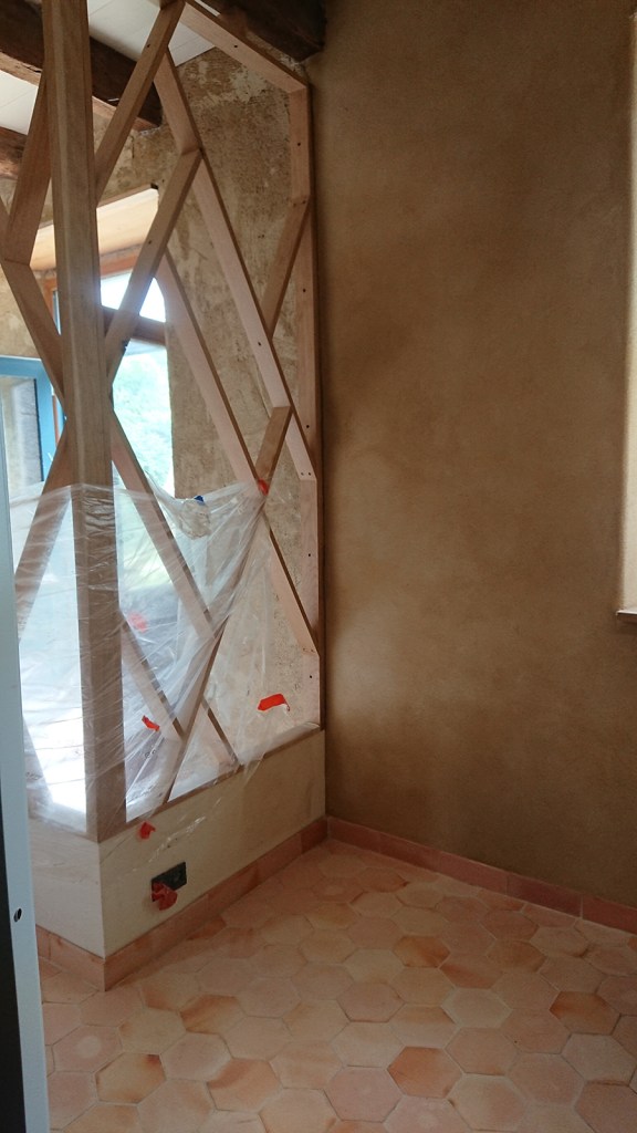 J’en ai profité pour placer les prises avec les caches coté cuisine. Nous avons tout débâché, nettoyé et j’ai pu appliquer de l’huile de protection sur la tomette à l’enduit où été initialement l’échafaudage.
