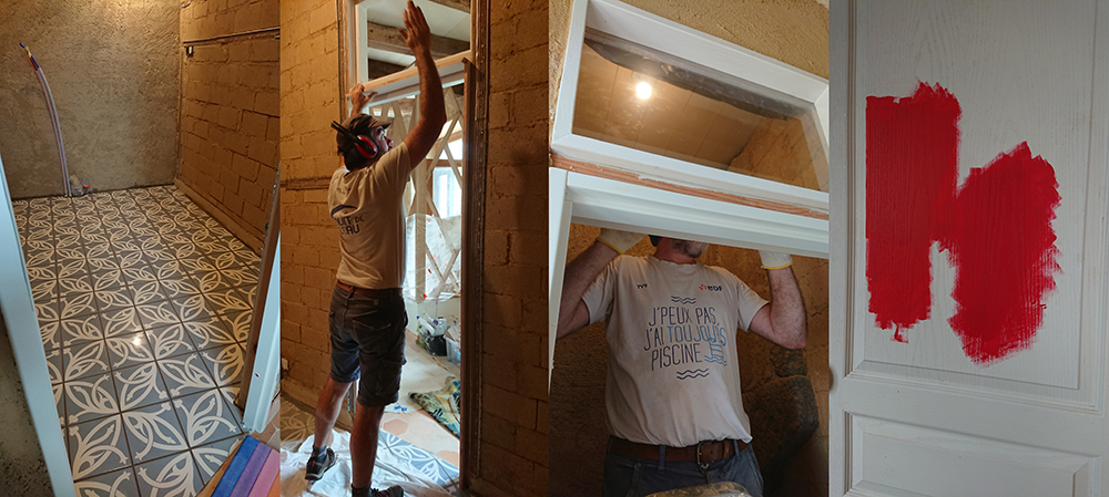 Et enfin pour assurer une accroche autour des portes à l’intérieur, Gwen a fixé des morceaux de voliges pour créer des arrêts pour le dégrossis. Il les a fixé dans les deux pièces (WC et toilettes).