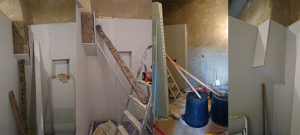 Avec utilisation du mobilier sur place, il a trouvé plusieurs moyen de faire tenir les 3 morceaux, chaque jour. Au final, la douche est prête à être imperméabilisée avant la pose du carrelage 🙂