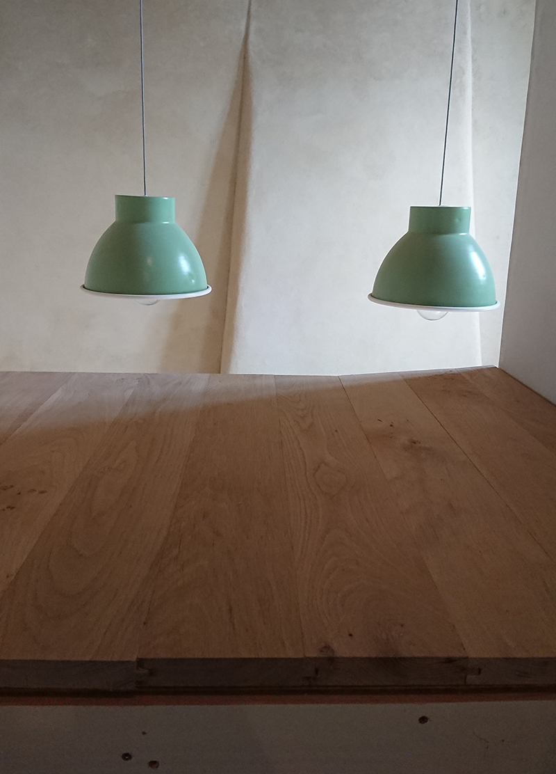 Une fois le parquet posé, nous avons réfléchit aux finitions pour que de la cuisine l’épaisseur ajoutée de parquet soit naturelle. Nous avons finalement réutilisé des planches de volige, que nous avons peintes.