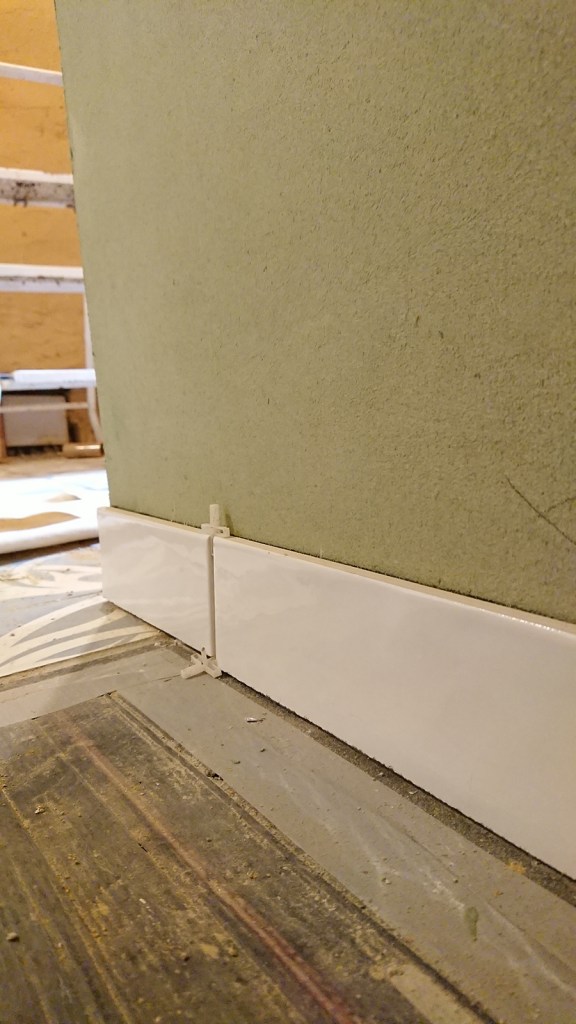 Pour commencer, nous avons découpé et posé le reste des plinthes carrelage de la salle de bain et des WC.