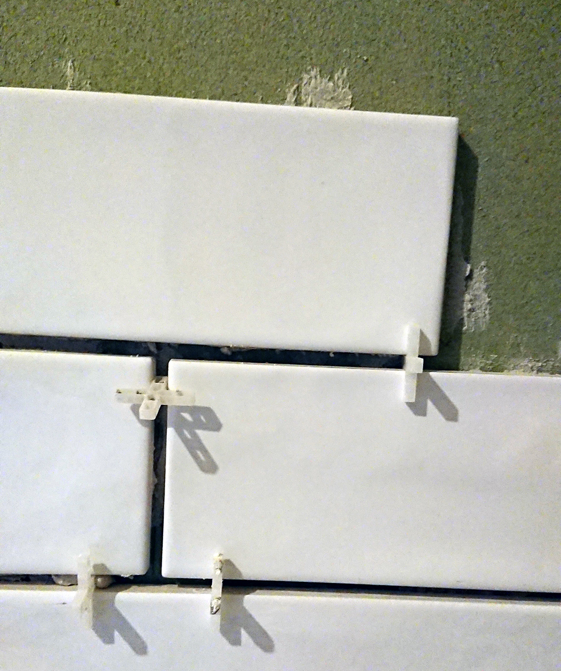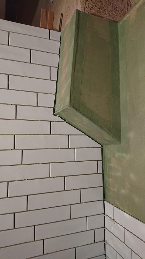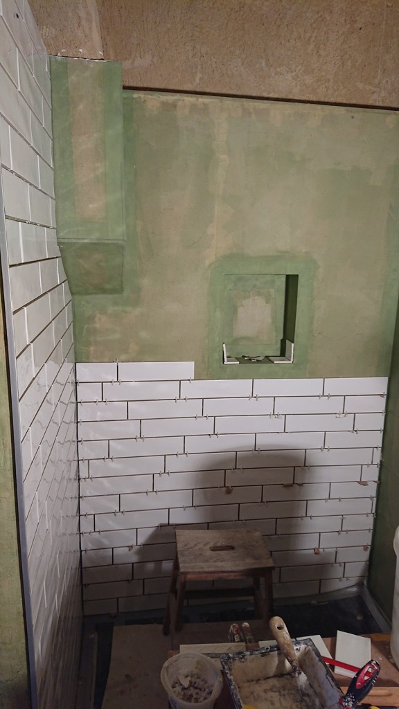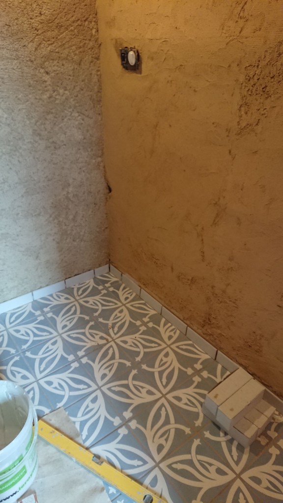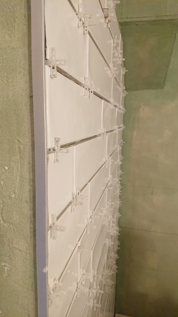Pour élargir encore un peu plus le panel d’activité du chantier, nous avons commencé la pose du carrelage mural de la douche du RDC. Un nouveau chantier de la team Picot MB / Picot AS.