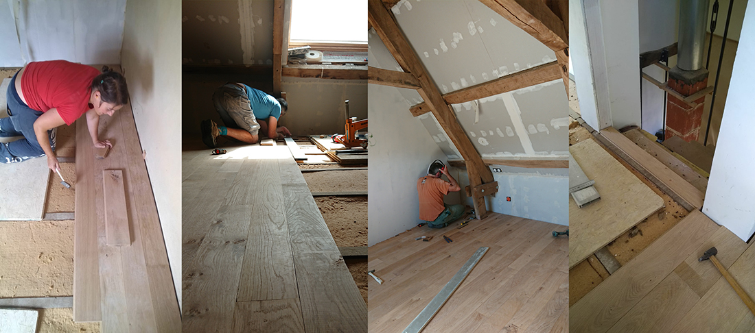 La partie chambre est toute terminée, même le long de la cloison de la trémie. La planche de seuil est posée. La prochaine fois que nous nous y mettons, nous attaquons l’entrée de la pièce et nous pourrons enfin marcher au confort !
