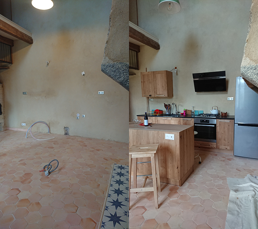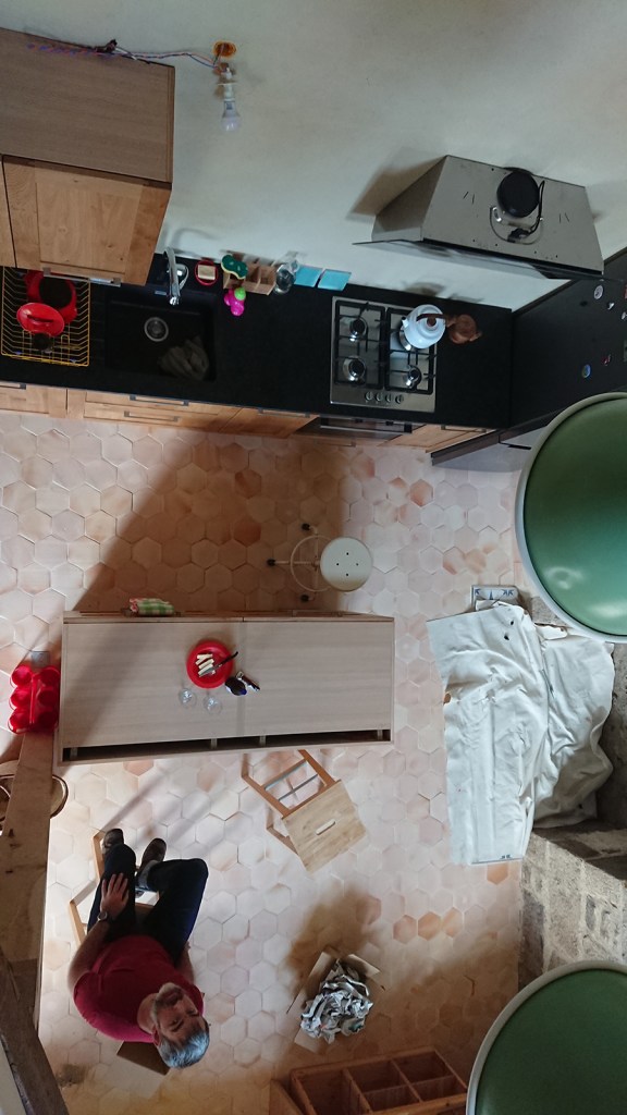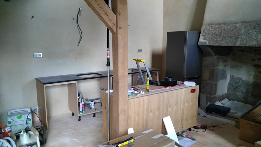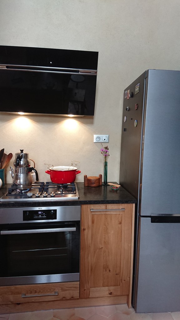 Mais c’est tellement confortable de disposer d’un espace cuisine, avec le 2nd robinet de la maison et cette fois à l’intérieur. Nous avons déjà investi les lieux, même s’il nous reste la crédence à poser ainsi que la livraison de la suite de la cuisine : plan de travail noir sur l’îlot central et sa table qui vient dans la continuité.