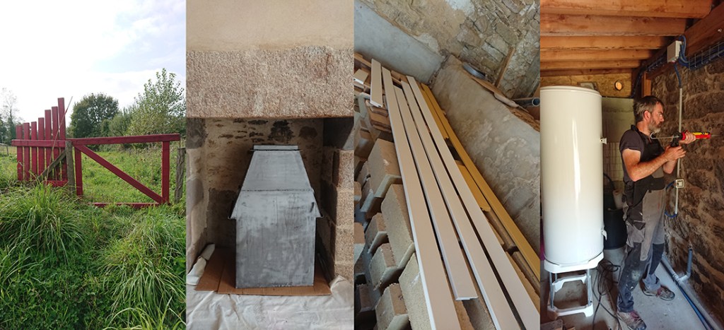 - Et enfin, nous avons fixé le chauffe-eau dans la buanderie. J’ai poussé le vice jusqu’à le brancher (sans y mettre le jus) mais il me manque un raccord pour faire un test d’eau chaude.