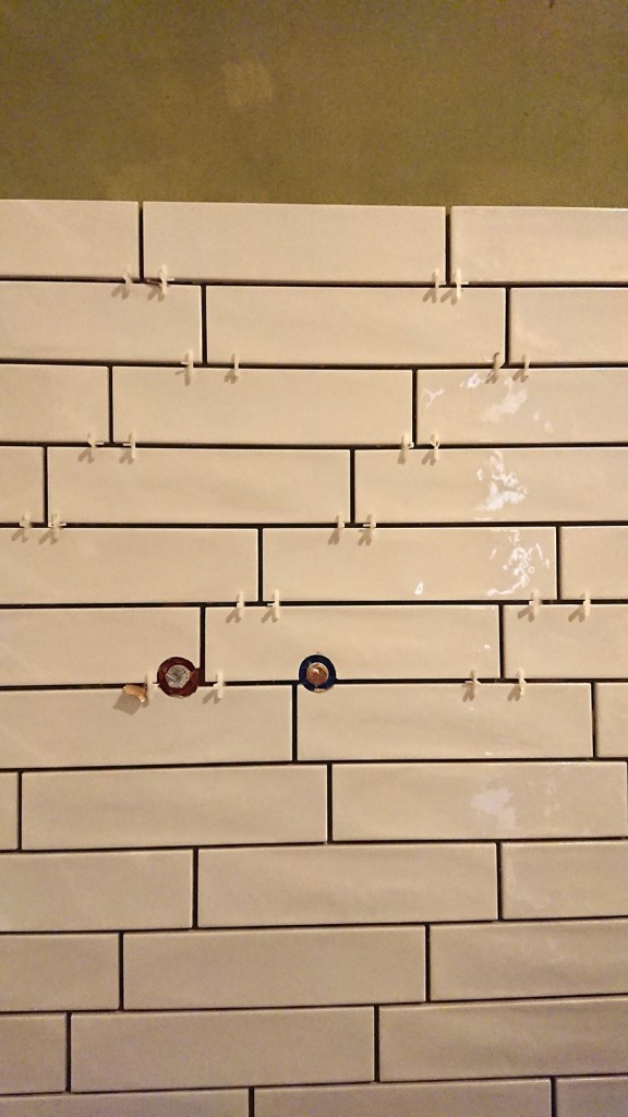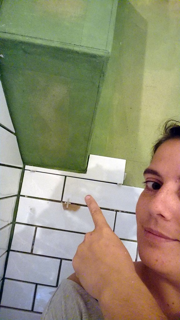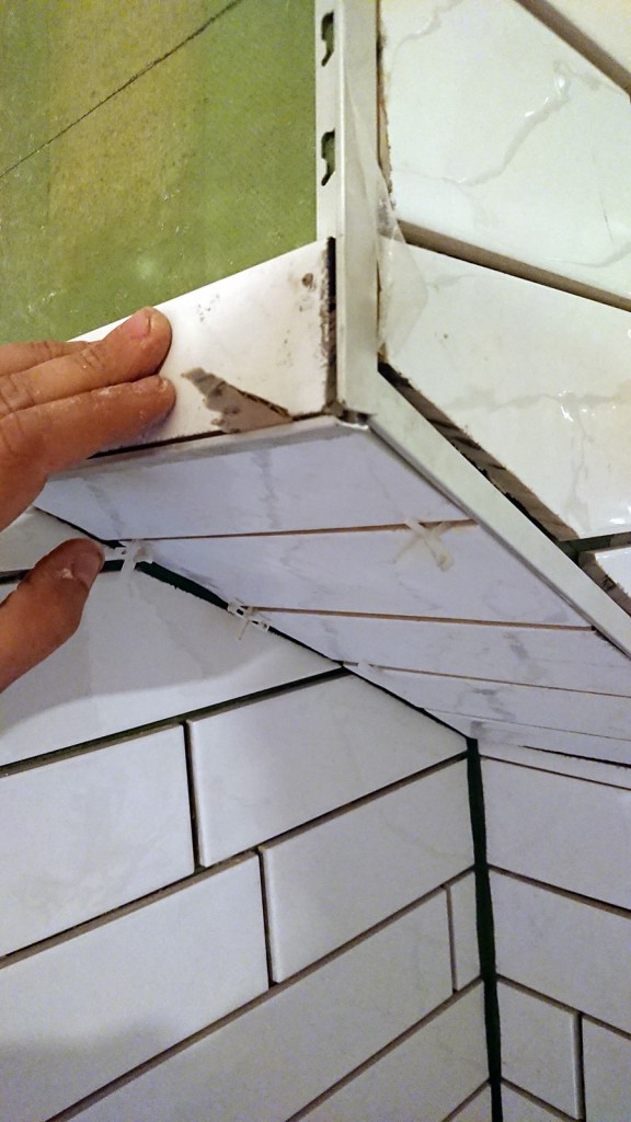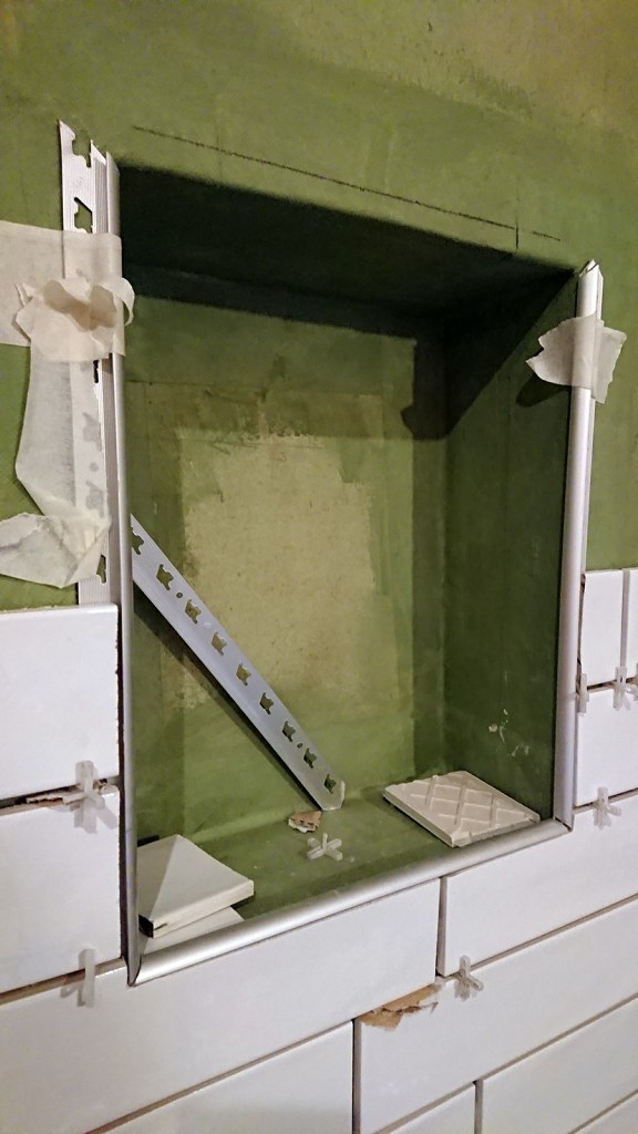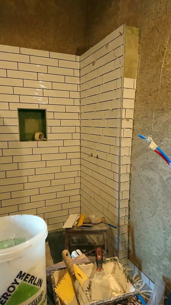 J’ai repris le travail dans la douche pour avancer sur le carrelage, cette fois en m’occupant des découpes et de la pause, je suis allée beaucoup moins vite mais j’ai attaqué les zones « sensibles » : la niche et le coin de la cheminée.