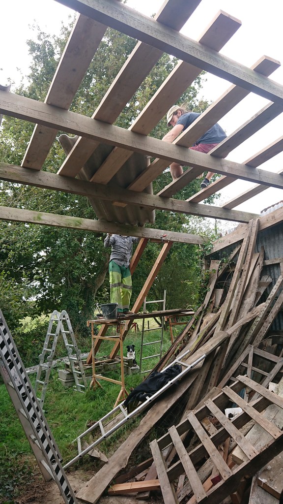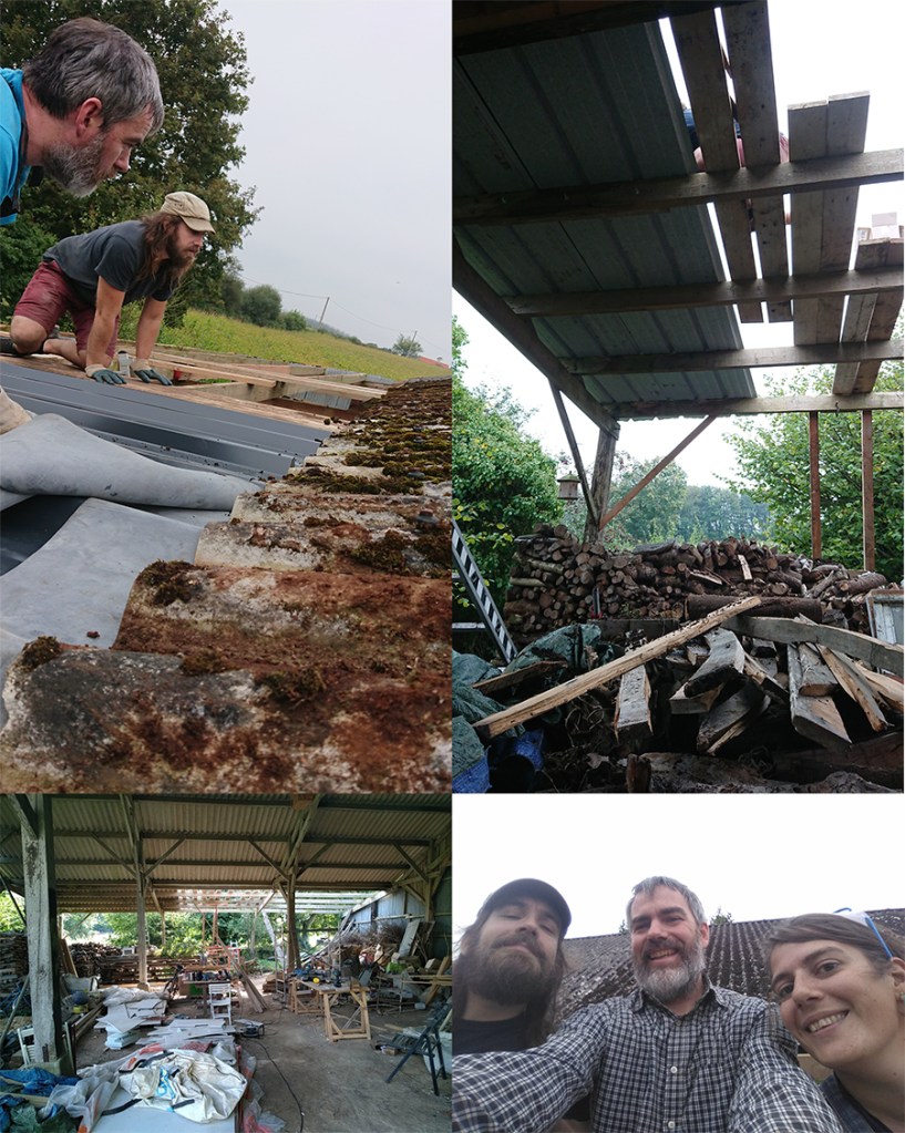 Première partie du chantier, découvrir ou terminer de découvrir. Descendre les plaques de fibro-ciment sur la pente basse du hangar notre système de pente.