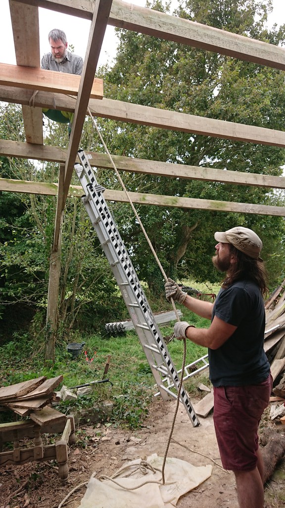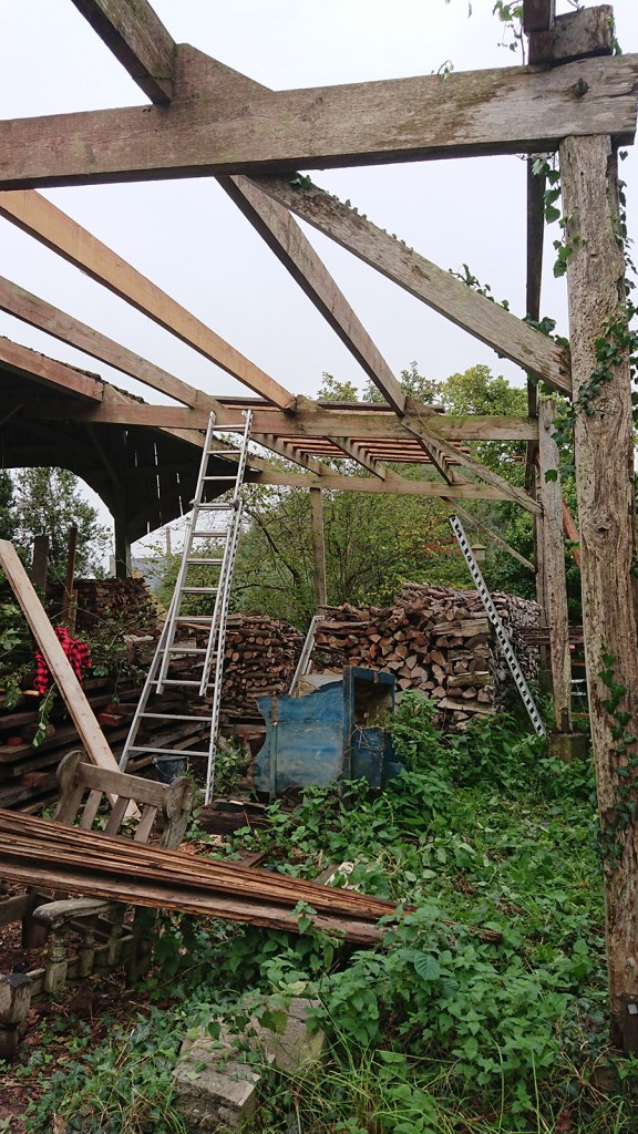 Nous avons découvert en faisant cela qu’il n’était pas possible de garder une des pannes et nous l’avons changée. Nous avons aussi ajouté deux renforts sur la partie la plus à l’Est de la charpente, là où la toiture percée laissait l’eau s’infiltrer.