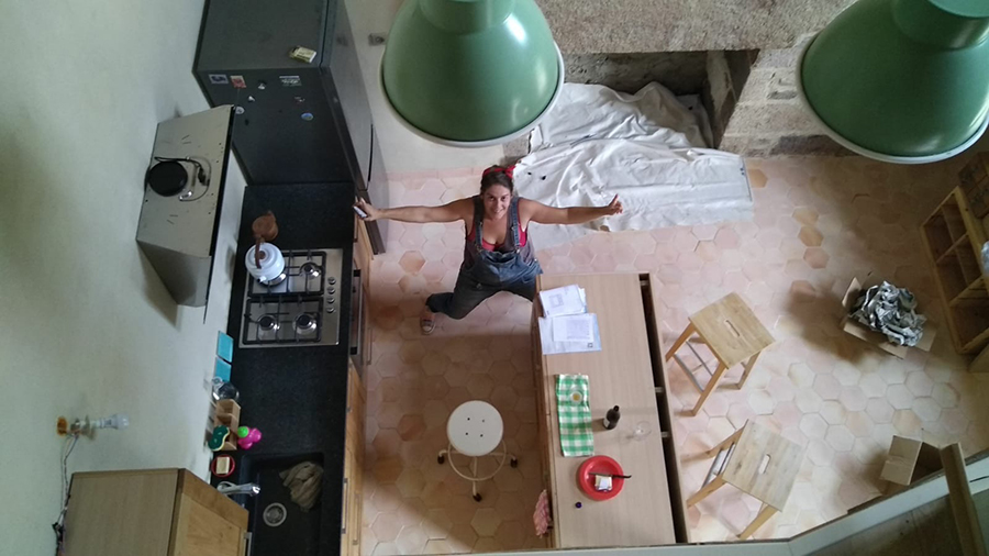 Pendant que l’installateur s’affairait dans la cuisine, Gwen s’est lancé dans la réparation de la marche de l’escalier, juste avant d’entrer dans la chambre.
