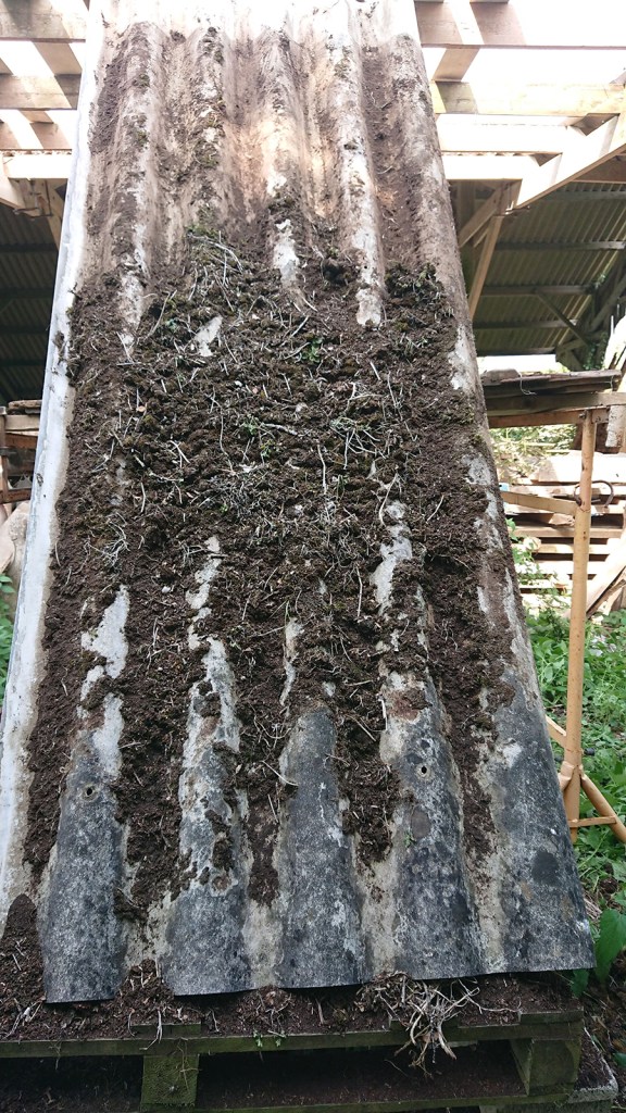 Que de matière nous avons trouvé sur le toit. Plus nous avancions dans la découverture, plus les plaques étaient lourdes et chargées de mousses, plantes et même lombric !
