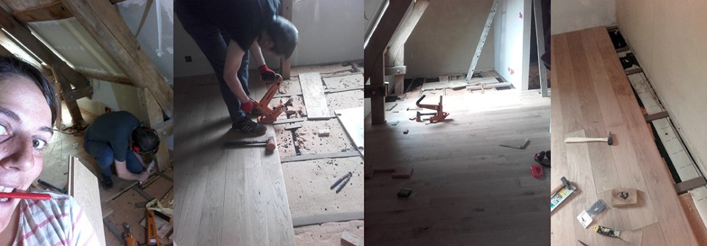Un travail d’équipe ! Julien venu quelques jours, m’a relancé sur le sujet parquet du grenier, mis de côté pour le hangar (un peu plus urgent).