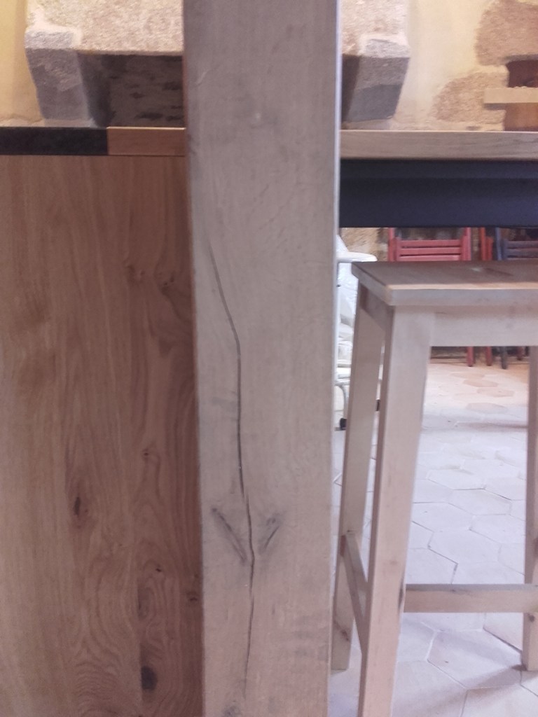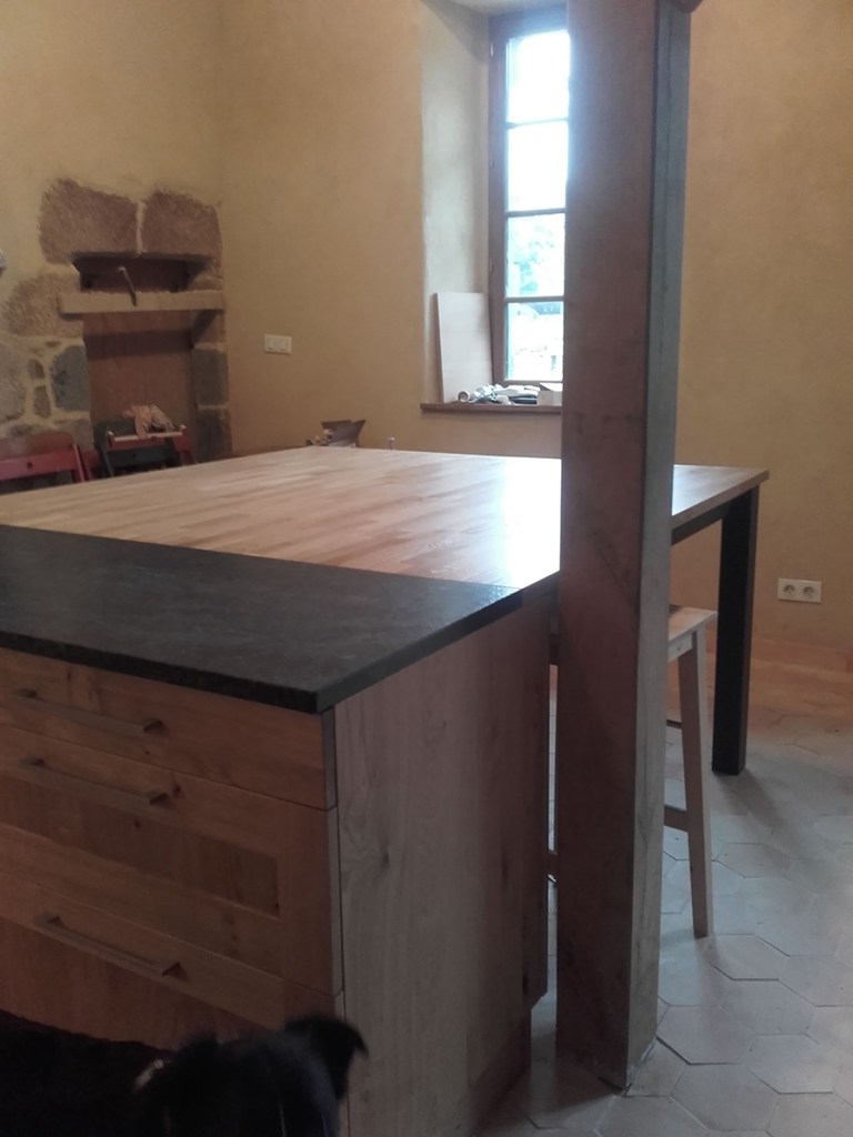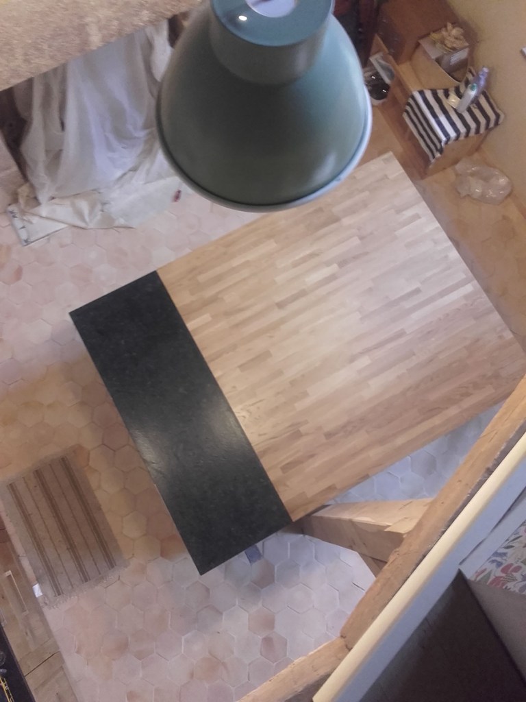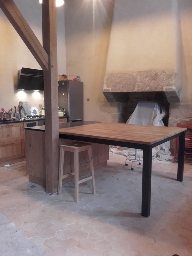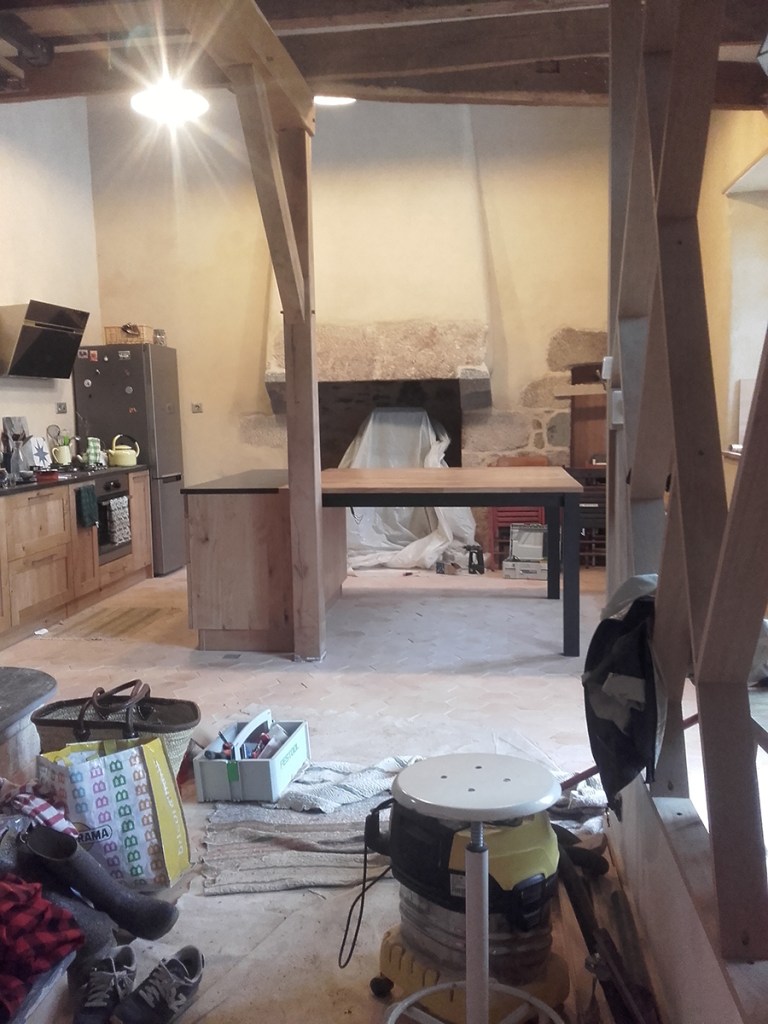 On l’attendait, elle a finalement été installée. Place à la grande table dans la cuisine. Après avoir déplacé la prise cachée derrière l’ilot, le plateau a été posé, ainsi que le plan de travail en granit.