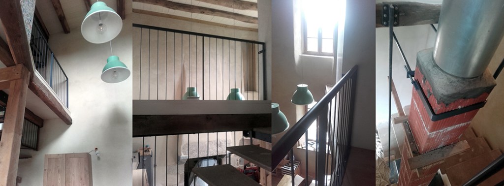On l’avait un peu oublié, mais Guillaume est venu fixer la colonne du poêle (image 4), mais il a aussi installé le garde-corps de la passerelle.