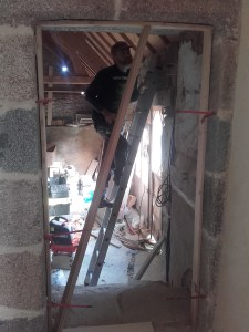 En attendant de condamner cette porte temporairement, nous avons besoin de bandes de redressement, et pour cela, Gwen a posé les banches. A moi de jouer ensuite avant de découper de la laine de bois et du fermacell.