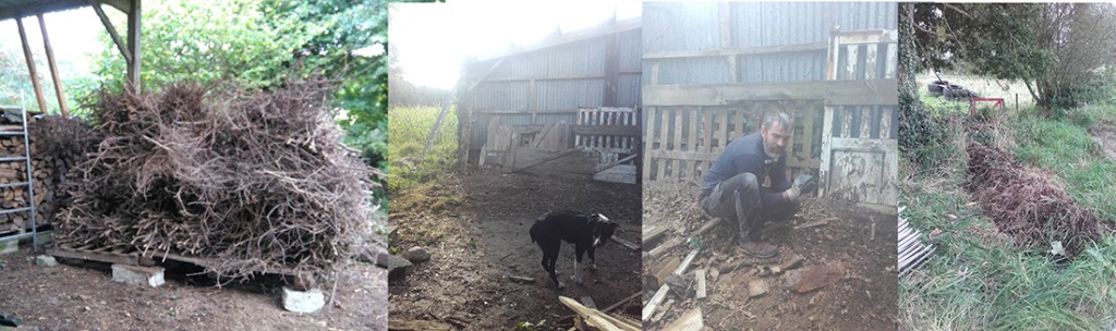 Au passage de Julien il y a une grosse semaine, nous avons utilisé une partie du bois complètement rongé comme base pour la création de deux buttes qui marquent la jonction entre notre terrain et le champ de mais du voisin.