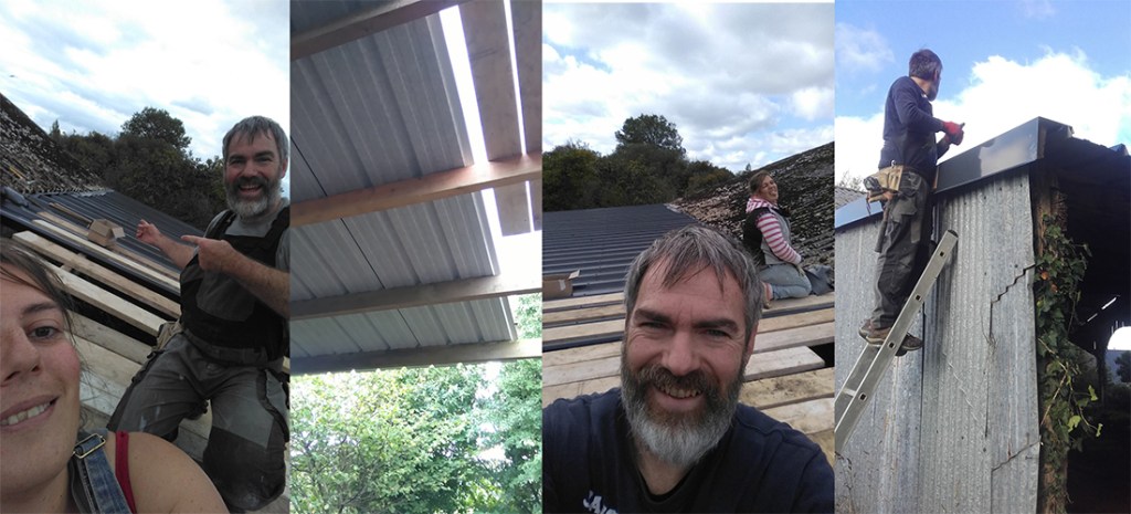 Même si nous avions quelques appréhensions à continuer juste tous les deux, nous avons trouvé le moyen de terminer la pose des bacs acier.