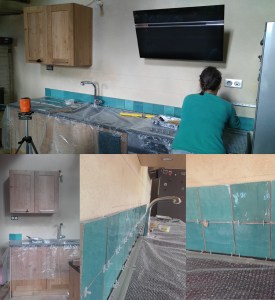 Comme pour se féliciter d’avoir achevé carrelage, bacs acier et parquet, nous avons commencé la pose de la crédence dans la cuisine.