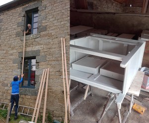 Double programme, d’un côté Ywann et Yoan sont revenus pour réaliser les enduits terre dans la maison : salle de bain, WC et poêle et de l’autre la team Picot nous a apporté des fauteuils et de l’énergie.
