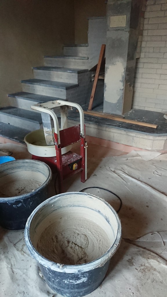 Début lundi matin, installation du chantier, on remonte des seaux de terre (stockée dans le bas de la longère depuis quelques semaines), on protège le sol dans l’entrée de la maison et on se lance : nous a la préparation des mélanges et Ywann et Yoan au reste 🙂