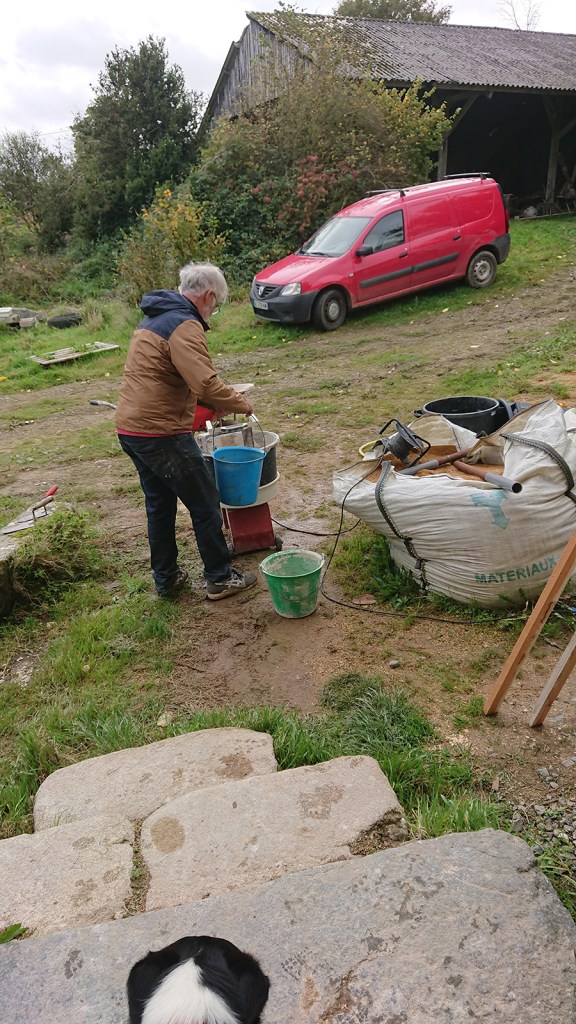 Le lendemain, l’équipe Picot est venu nous rejoindre. Papa a retrouvé avec plaisir le mélangeur (plus facile de préparer la terre que le chaux/sable).