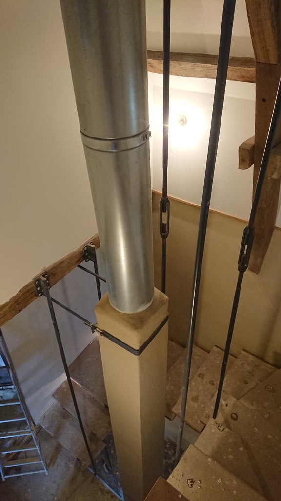 Elles ne peuvent être en enduit terre, qui serait trop fragile au passage répétés dans l’escalier. Nous avons demandé à Guillaume, qui nous a fait l’escalier de nous découper des plaques d’acier que nous viendrons coller sur les contres marches.