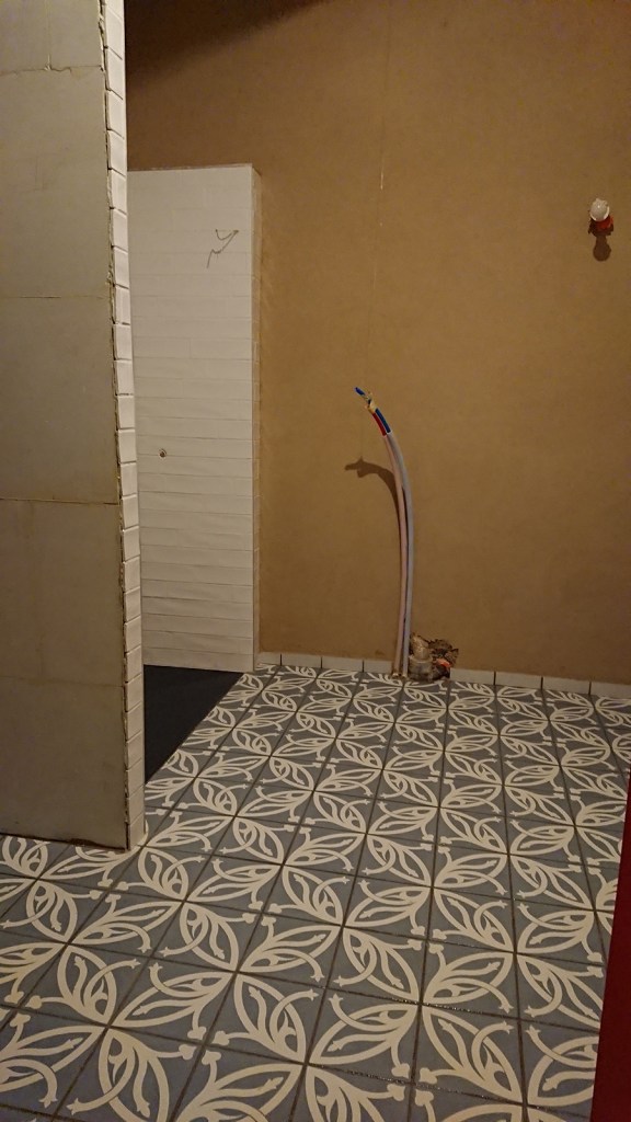 Deux jours passés, nous avons fait la première chauffe pour aider la maison à sécher. Le poêle a très rapidement montré ses stades de séchage. La salle de bain est praticable pour la suite (plomberie et porte de douche).