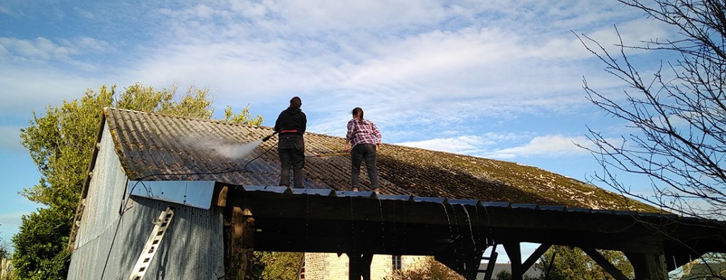 D’un côté, Laura et moi avons gratté le toit du hangar pour enlever le plus de mousse possible, puis passé le karsher.