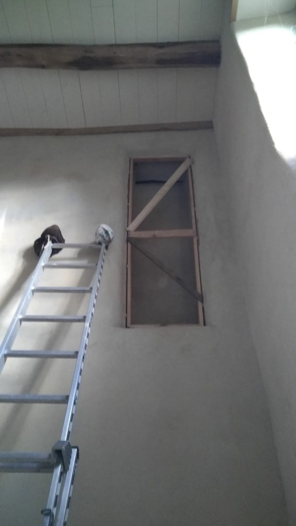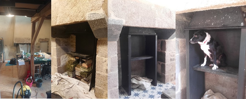 Pour la cheminée, il reste à installer un coffrage au dessus pour boucher l’ouverture entre le manteau de cheminée en pierre et la nouvelle cheminée ainsi qu’un rebord dans le foyer.