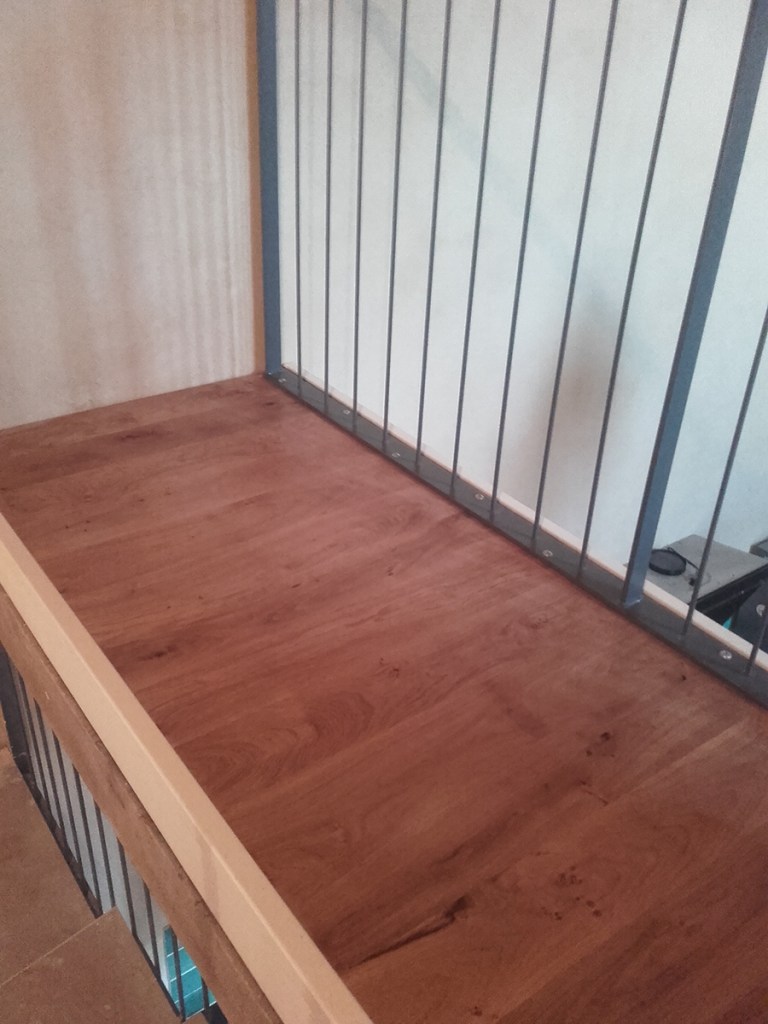 - Nous avons terminé la pose de la verrière de l’escalier et Gwen a réalisé une tablette côté pièce, avec un reste de parquet.