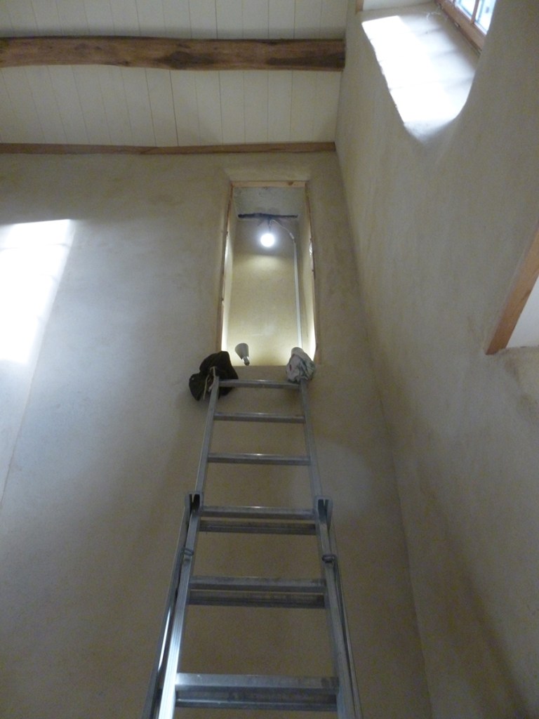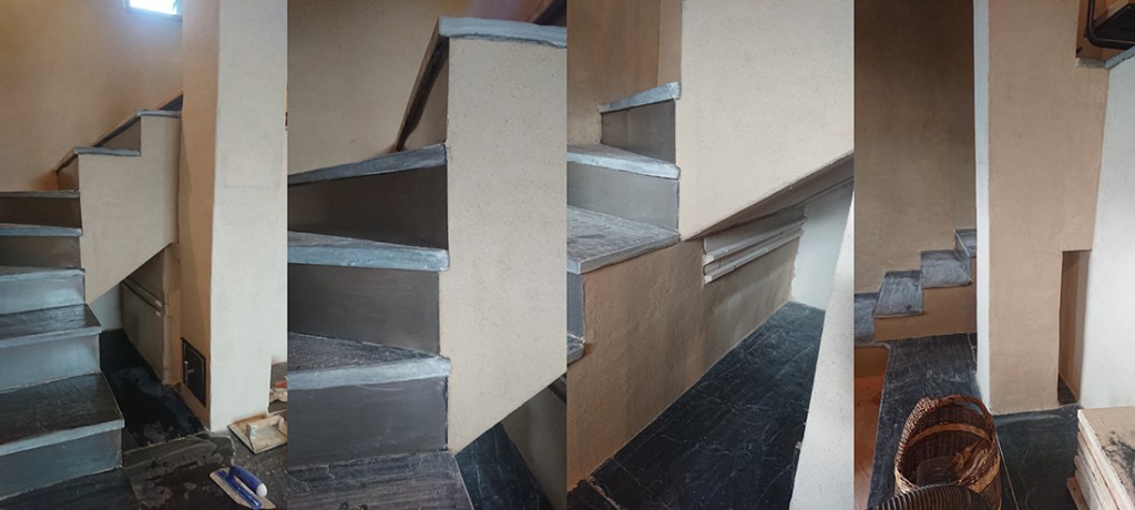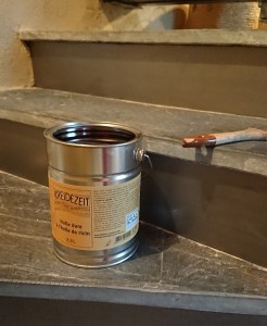 Avant de laisser les maçons terminer les enduits sur le poêle, nous avons collé les contres-marches. Je les ai donc protégées de l’humidité avec de l’huile dure (la même que celle utilisée pour les parquets).