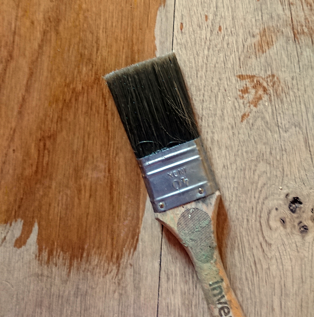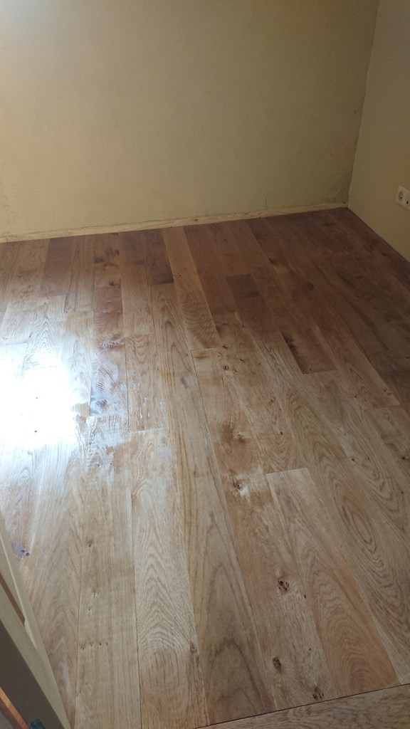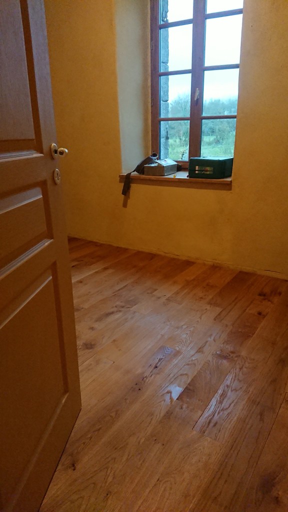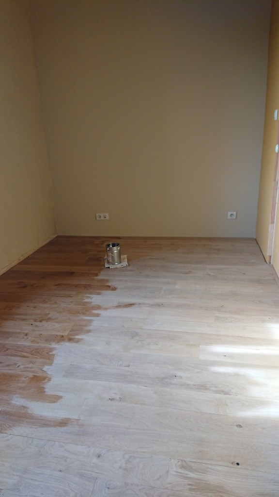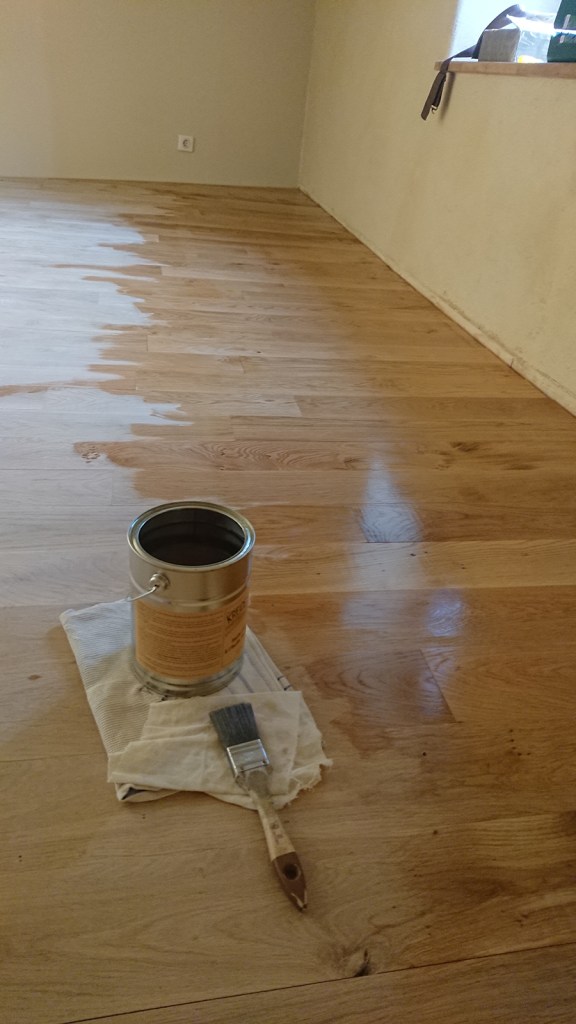 Après avoir terminé le ponçage fin des deux chambres, je me suis attelées aux 3 couches d’huile dure :