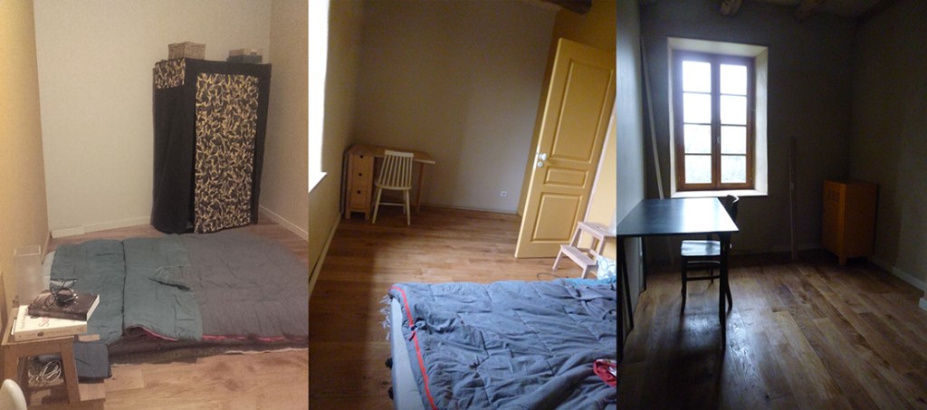 Une fois les plinthes collées dans les deux chambres, j’ai ressorti les affaires de camping pour aménager un bivouac de luxe dans la chambre jaune.