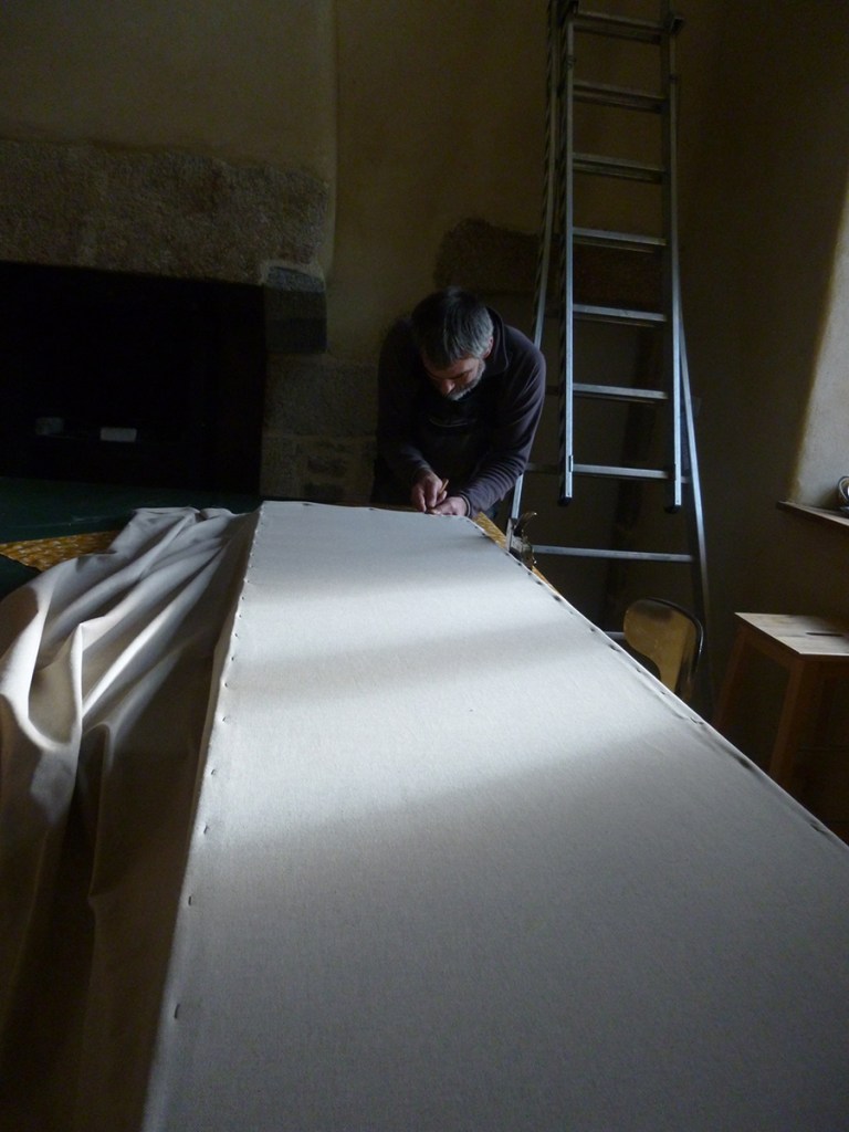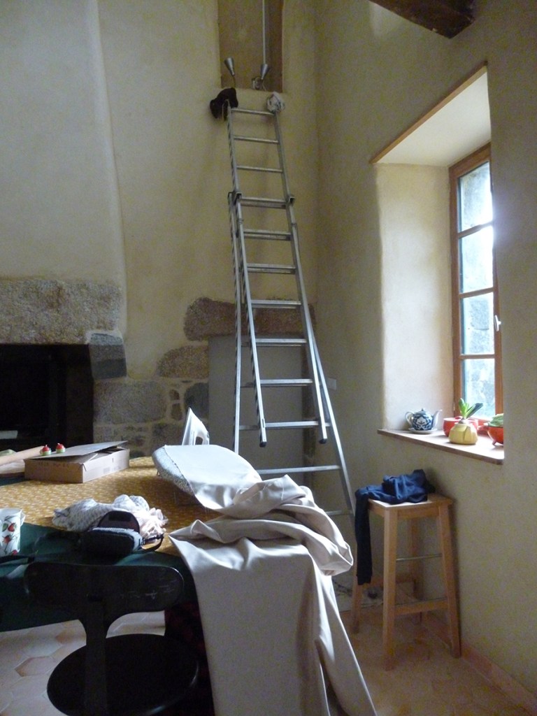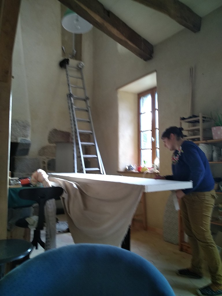 Anciennement armoire à même le mur, nous avions décidé de ne pas combler tout cet espace et de créer une niche lumineuse. Gwen a terminé de réaliser le cadre qui permettra de fermer cet espace. Je l’ai ensuite peint puis nous avons tendu dessus un lin clair.