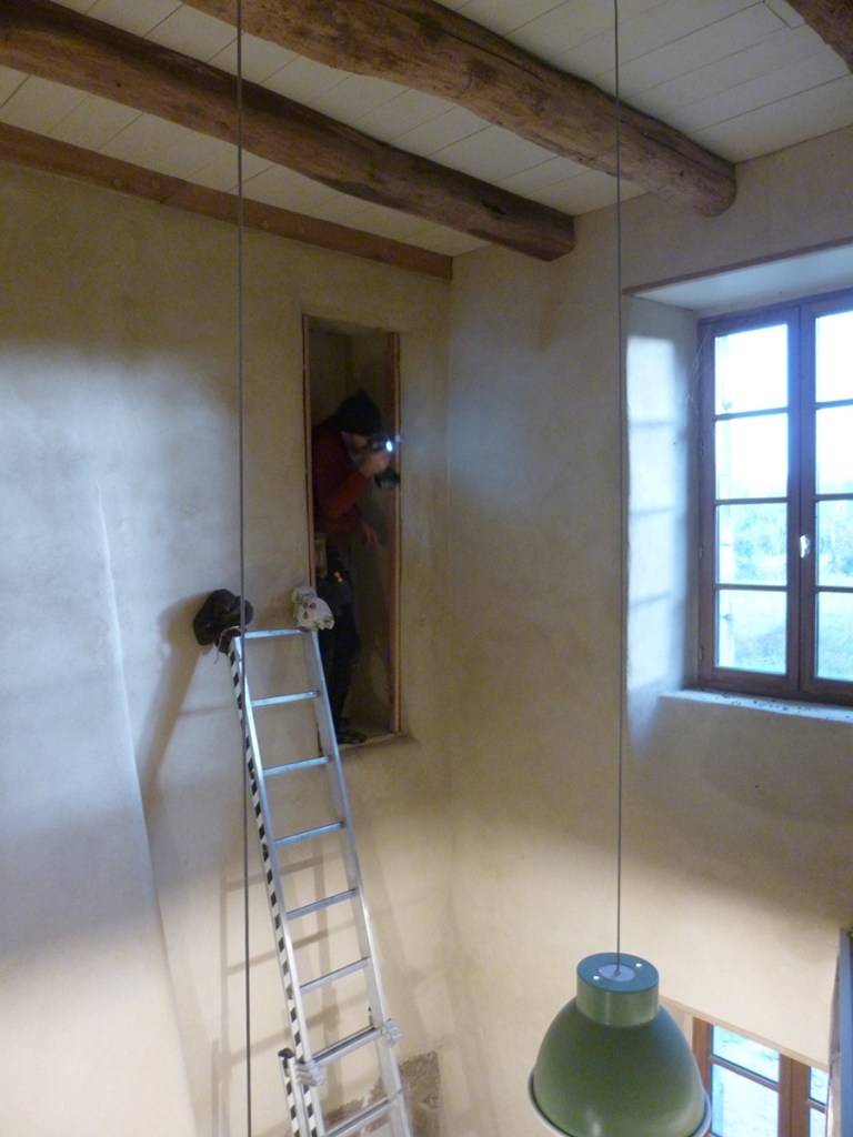 J’ai récupéré deux anciens spots de cuisine, que j’ai installé sur l’arrivée électrique là haut. Et Gwen les a fixé proprement.