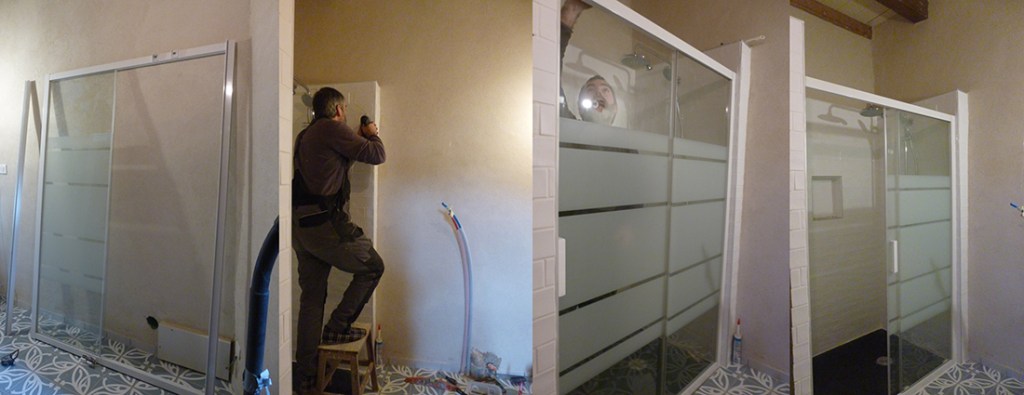 Deuxième et importante étape, nous avons monté la porte de douche. Comme nous avons acheté un modèle d’exposition, il manquait quelques morceaux, dont le mode d’emploi, mais malins comme nous le sommes nous avons retrouvé les étapes de montage. Il nous manque toutefois quelques caches plastiques, que nous devrons fabriquer.