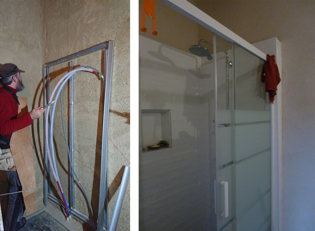 Nous avons une douche, un sèche serviette mais pas encore de lavabo. Pour l’instant, le brossage de dents se passe dans les WC.