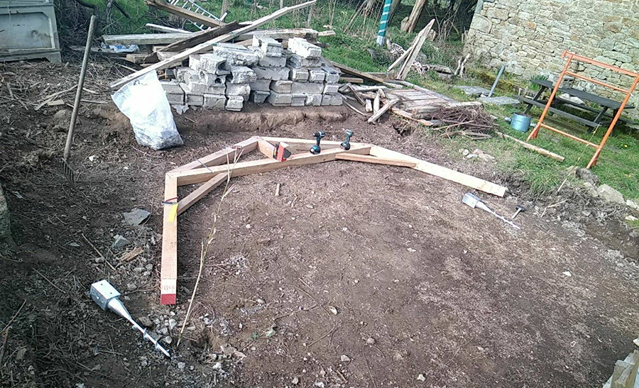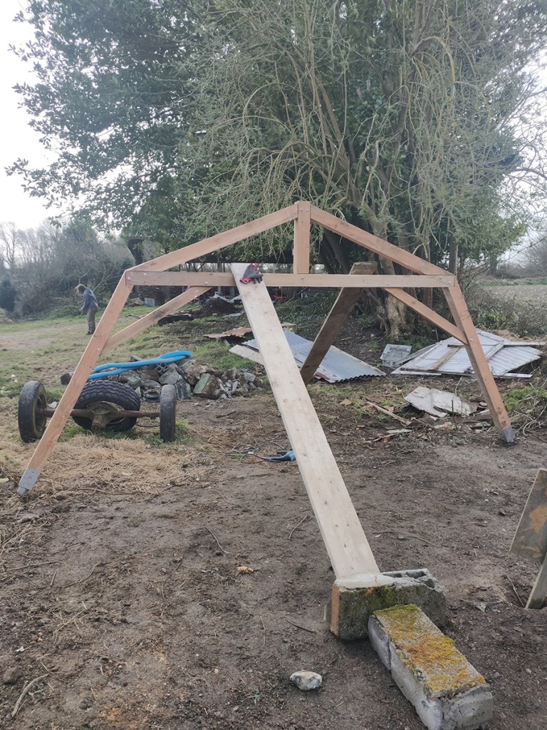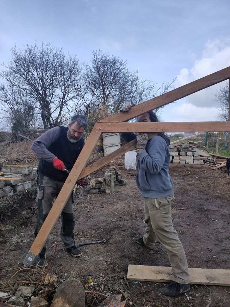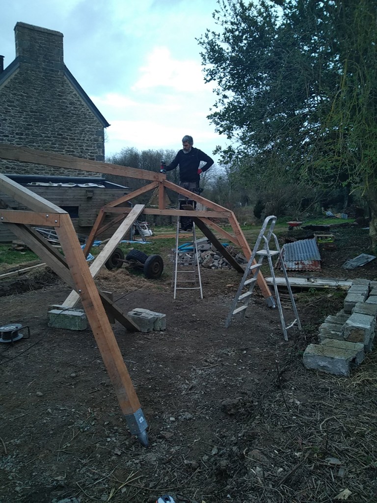 Avant de recevoir le bois et le verre, Gwen a encore un peu de menuiserie à faire : renforts et premières pannes.