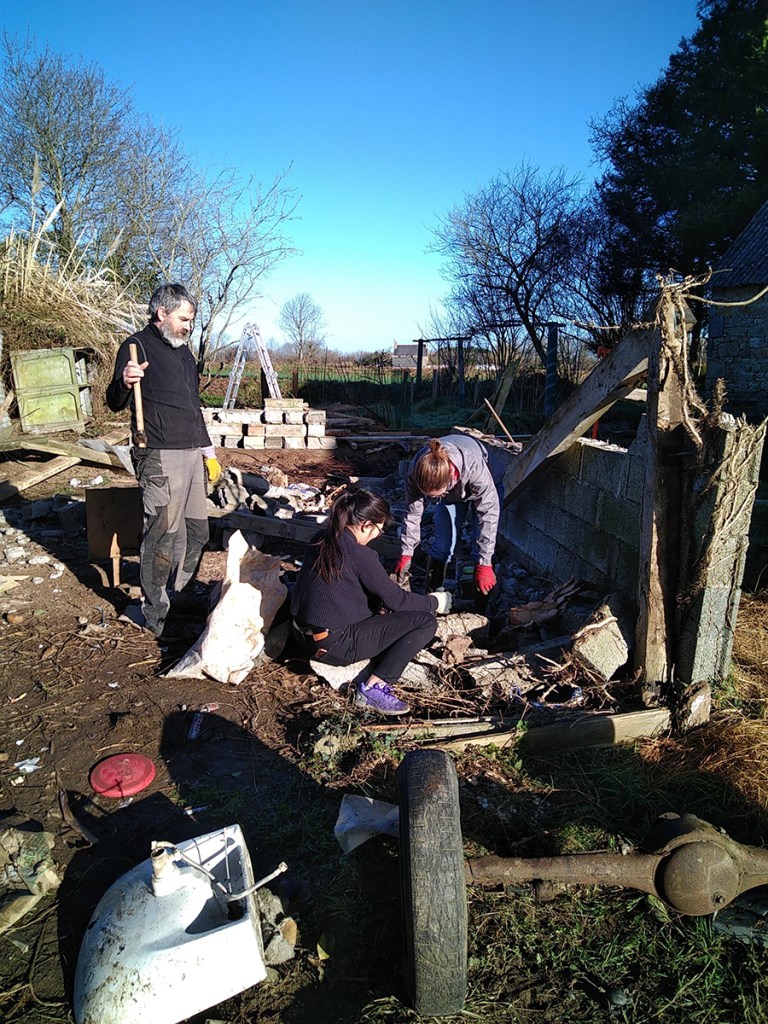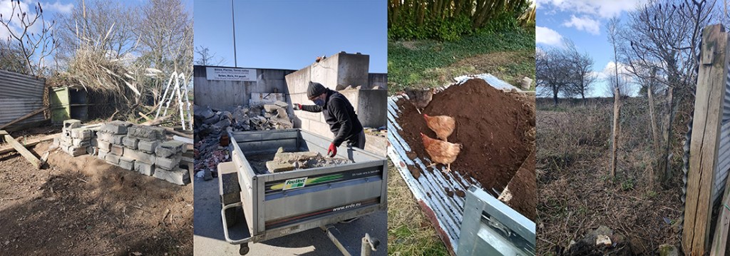 Nous avons essayé de récupérer le plus de parpaings entiers (que nous réutiliserons pour la base de la serre et pour créer les bacs. Le reste est parti à la déchetterie, où nous avons pu y récupérer de la terre (oh joie et bonheur pour les poules, image 2 et 3).
