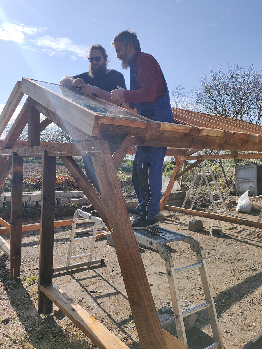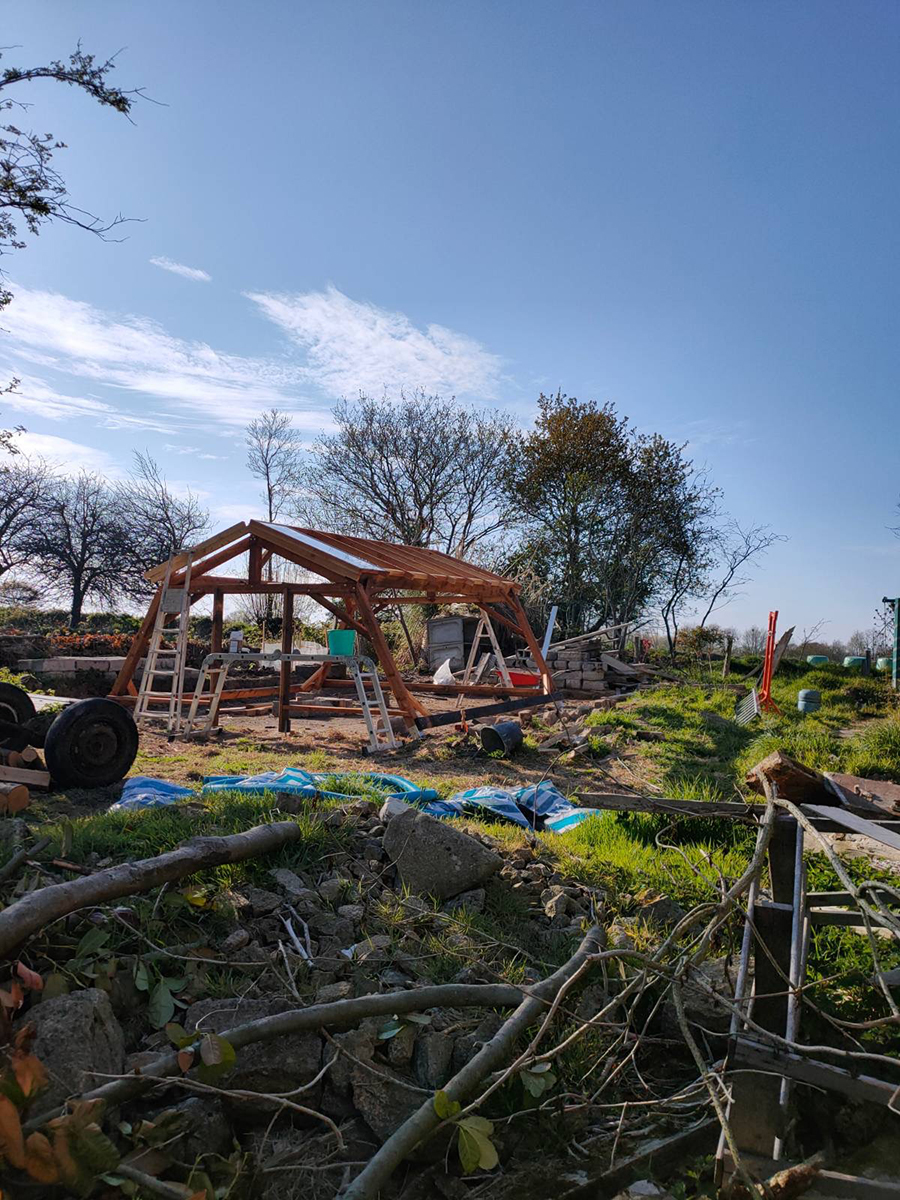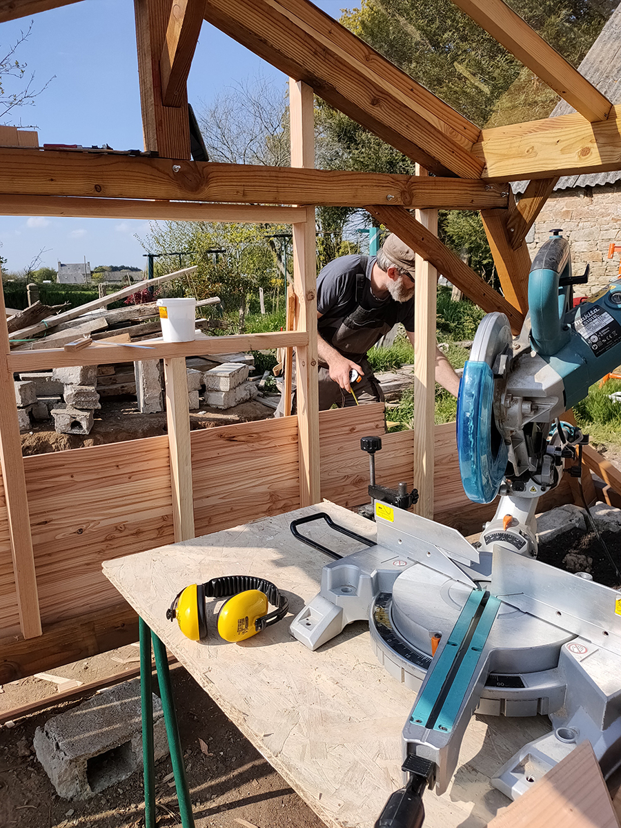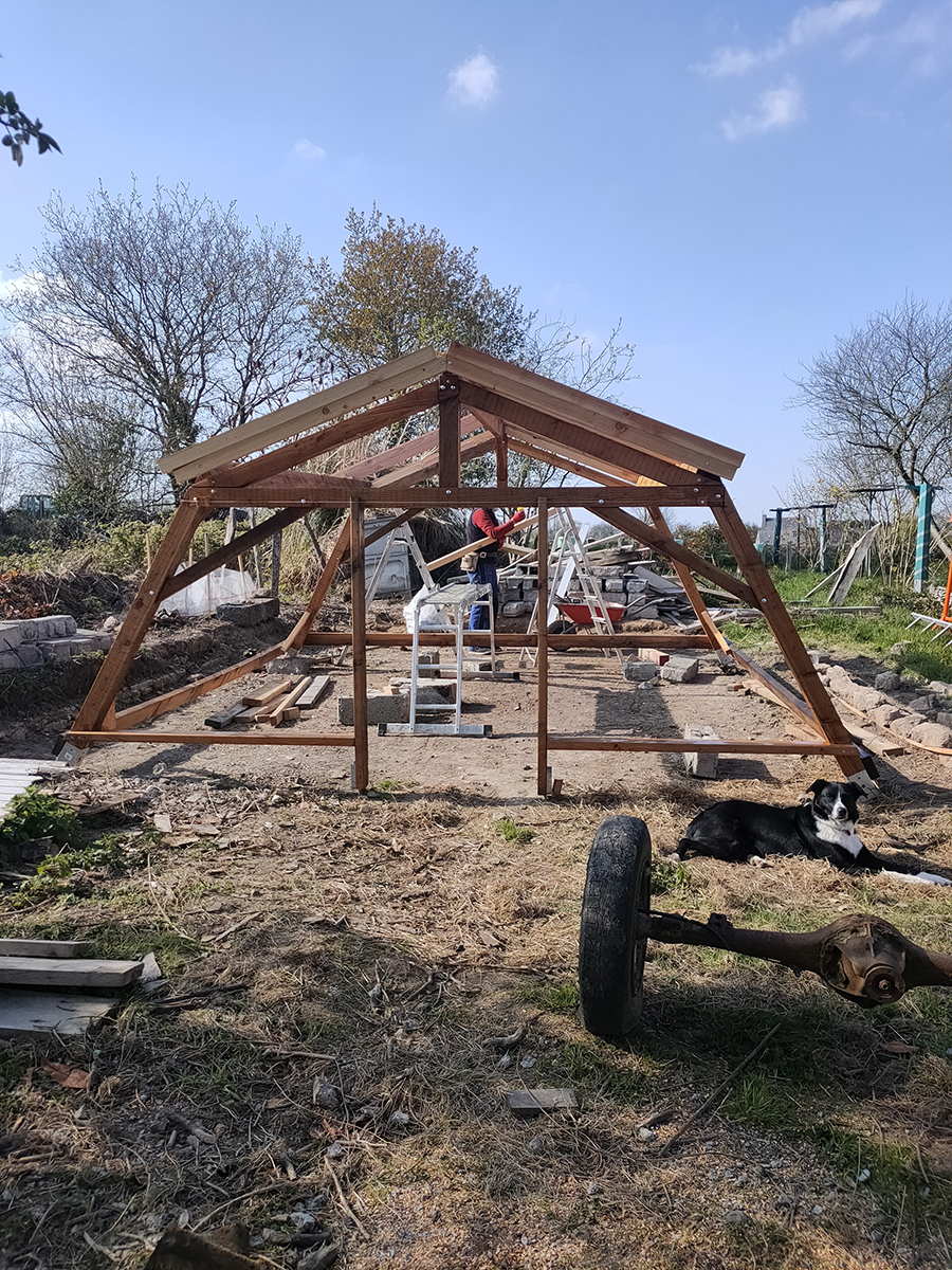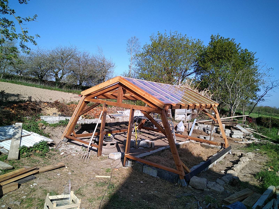 Les deux pentes sont terminées, il doit ensuite s’attaquer aux côté, c’est d’ailleurs ce qui nous manque pour bloquer les vents et planter nos jeunes pousses.