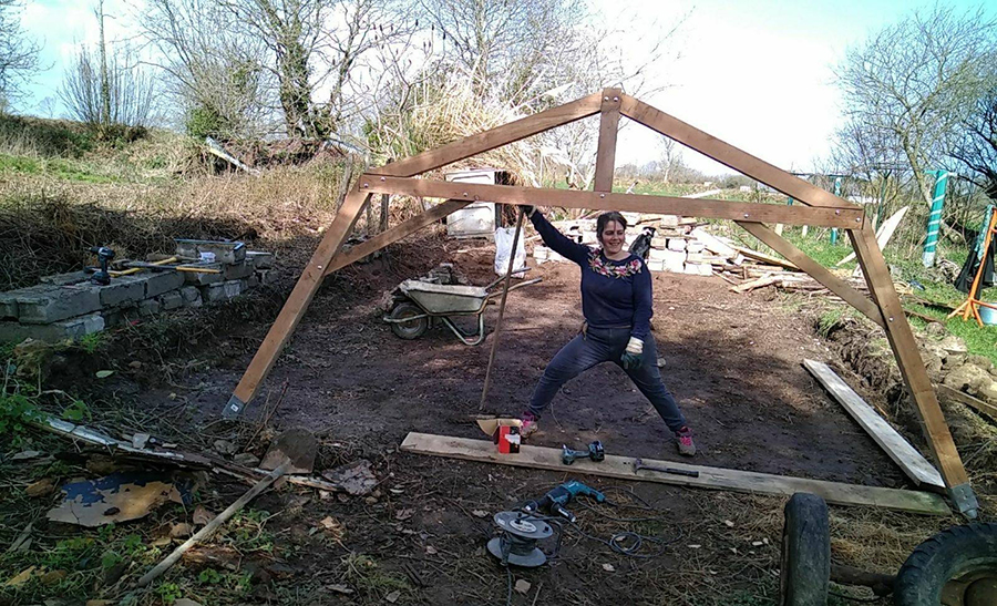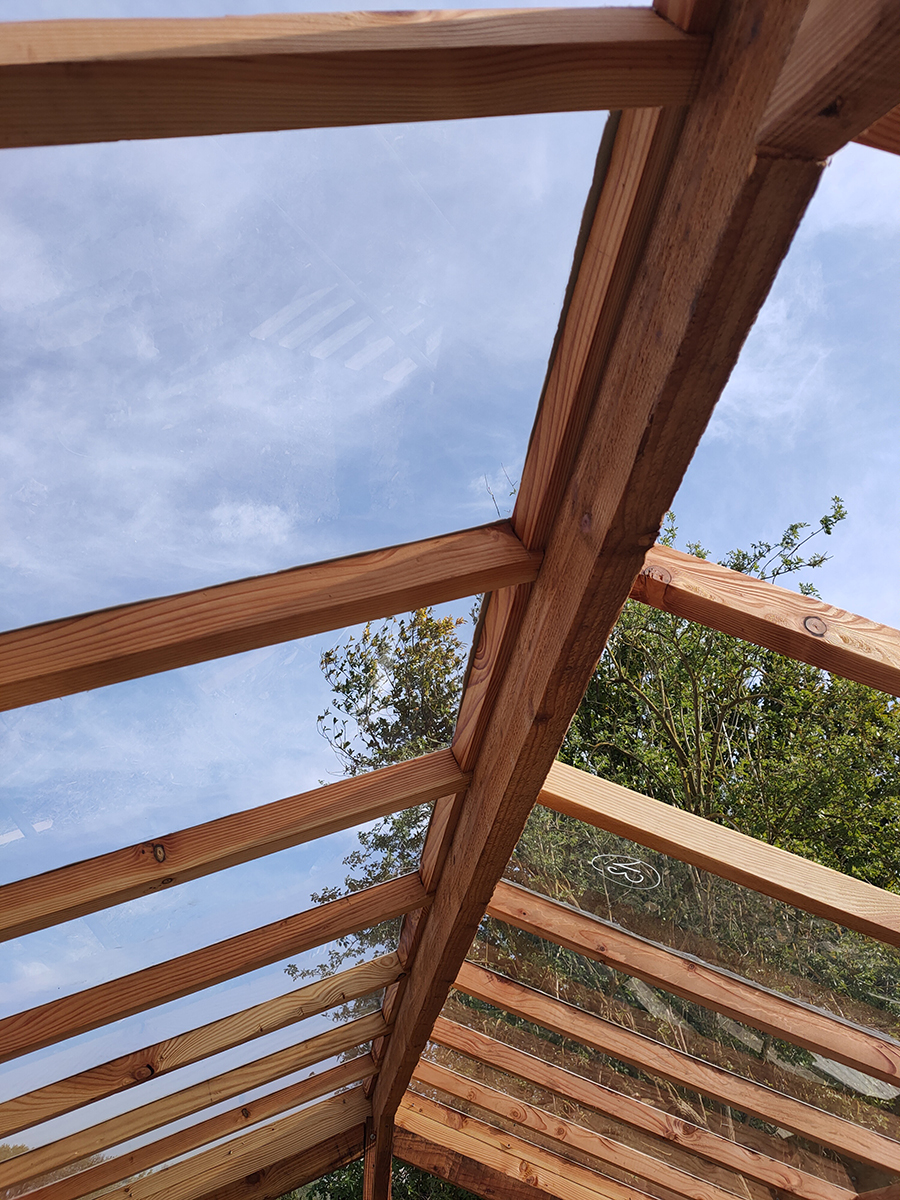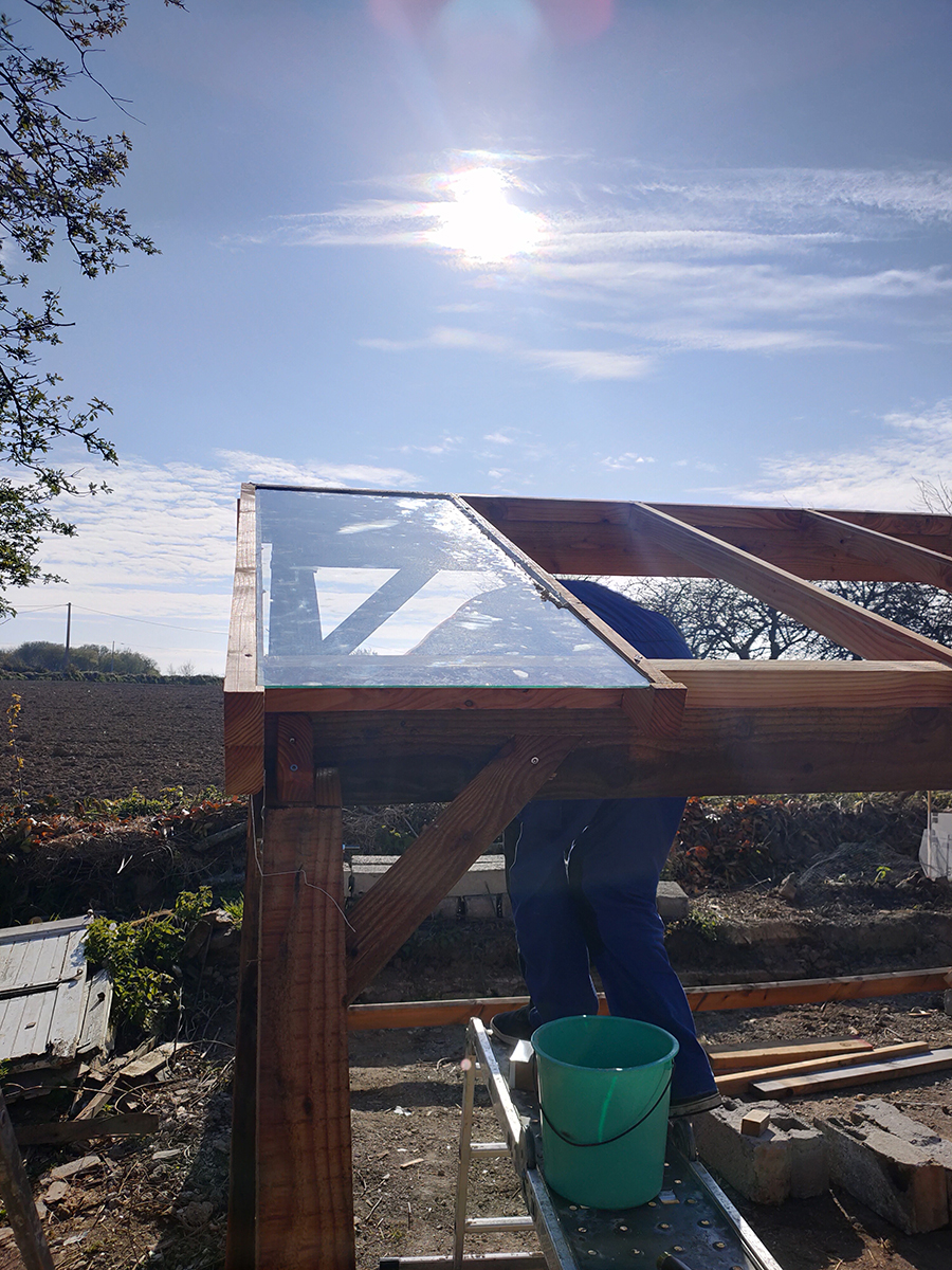 Une fois les cadres du toit installé, Gwen a commencé à poser les sections de verre.