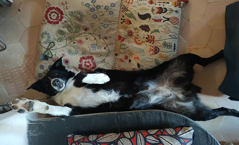 - Côté terrasse, deux déjeuners dehors nous ont donné une nouvelle idée de projet de création d’une terrasse devant la maison. En attendant, nous avons installé ces plaques, que nous utiliserons à terme dans l’appenti Nord sur une dalle de chaux.