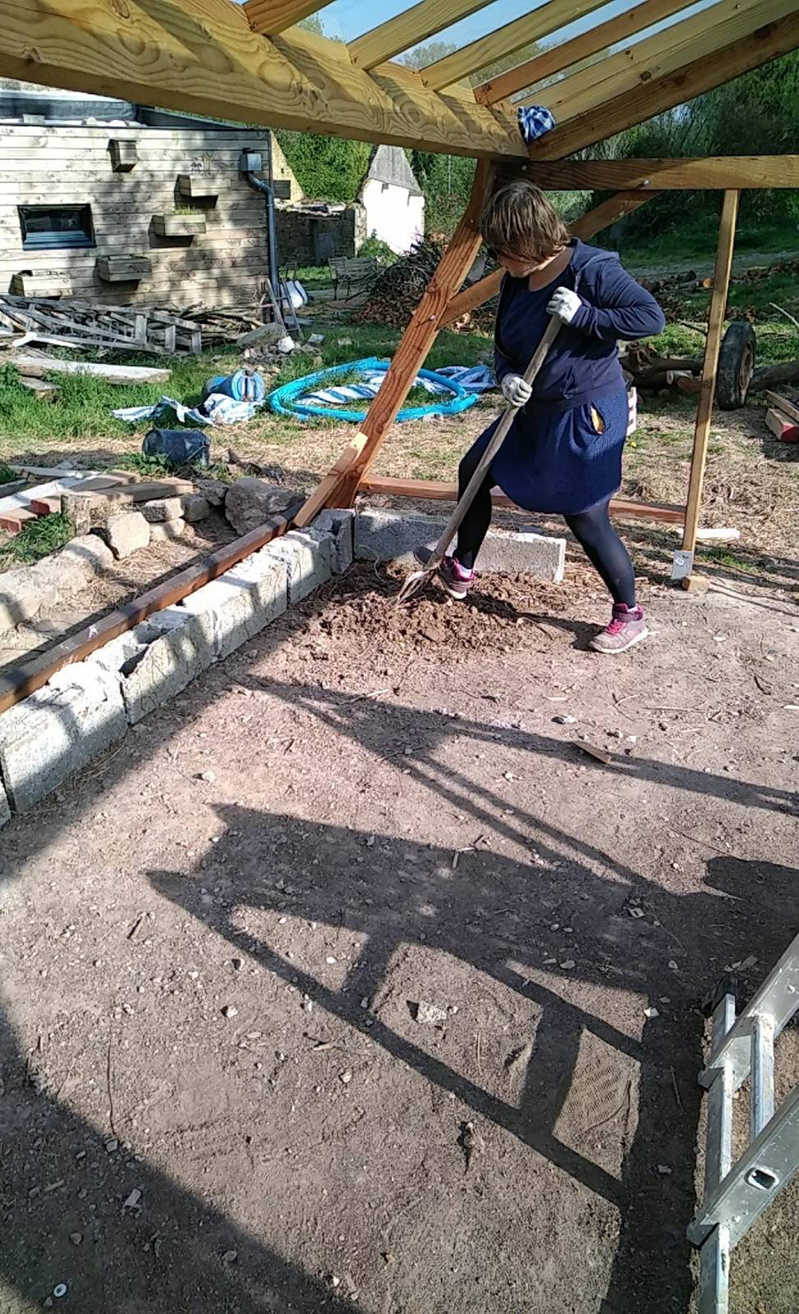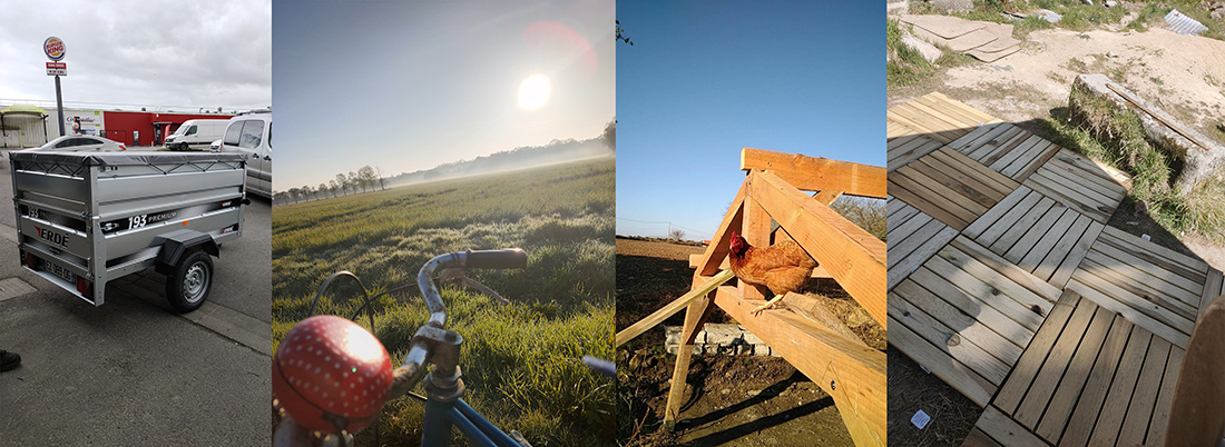 En vrac, un achat indispensable, la réparation des vélos et nos sorties matinales, le dressage des poules (pas tant que ça en bonne voie) et une terrasse provisoire.