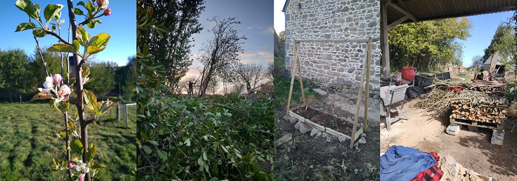 Pour favoriser le sureau de la haie du haut de la cours, nous avons fait tombé quelques lauriers palmes (sport annuel de la maison). Mise en tas des feuilles, mise de côté des grandes sections, nous avons commencé un nouveau tas de bois pour les prochaines années (images 2 et 4). Profitant d’un atelier de Gwen sous le hangar, j’ai rangé en big bag la terre et repris ce coin en main.