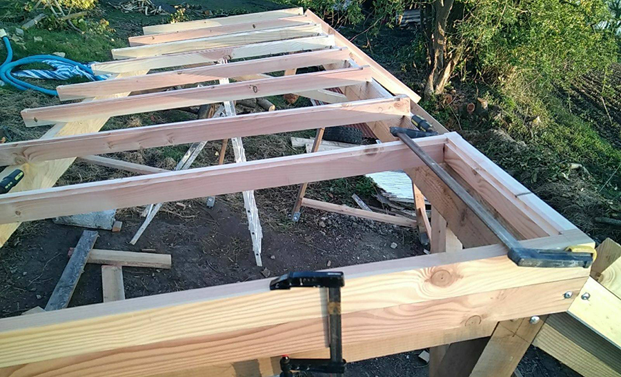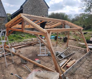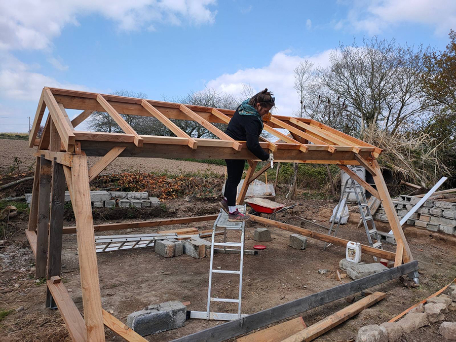 Depuis la photo, les deux pentes de toit disposent de leurs cadres, et Gwen a bien avancé sur les cadres des côtés.